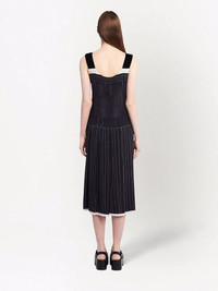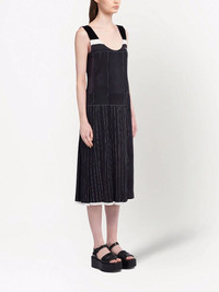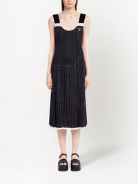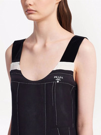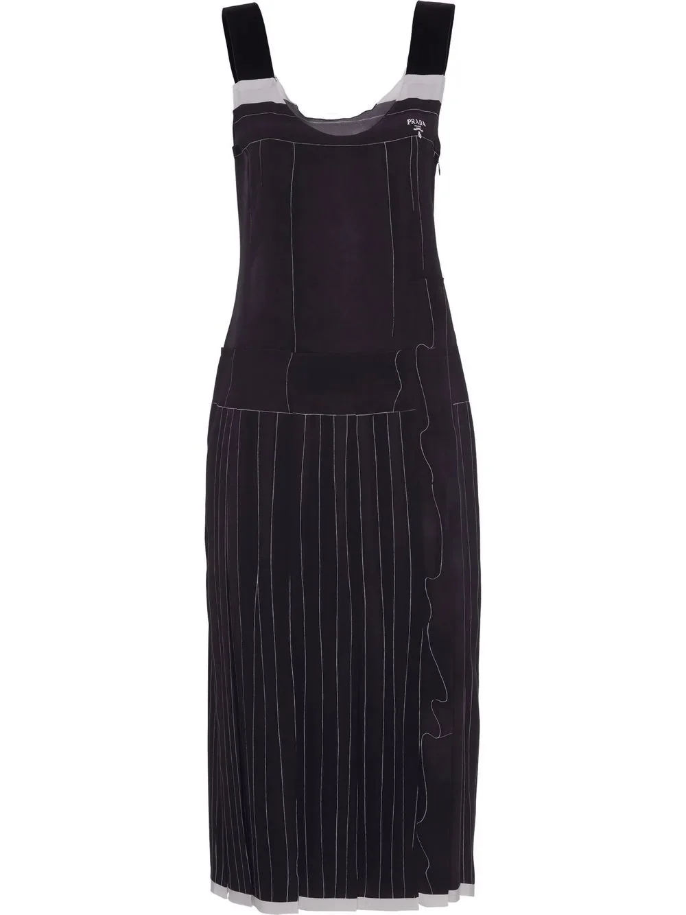 sleeveless silk midi dress Prada goes back in time with this 1920s inspired drop-waist shift silhouette. The silk dress is accented with a contrasting asymmetric pattern of thin stripes and finished with the brand's unmistakable logo lettering on the chest. Composition Silk 100%