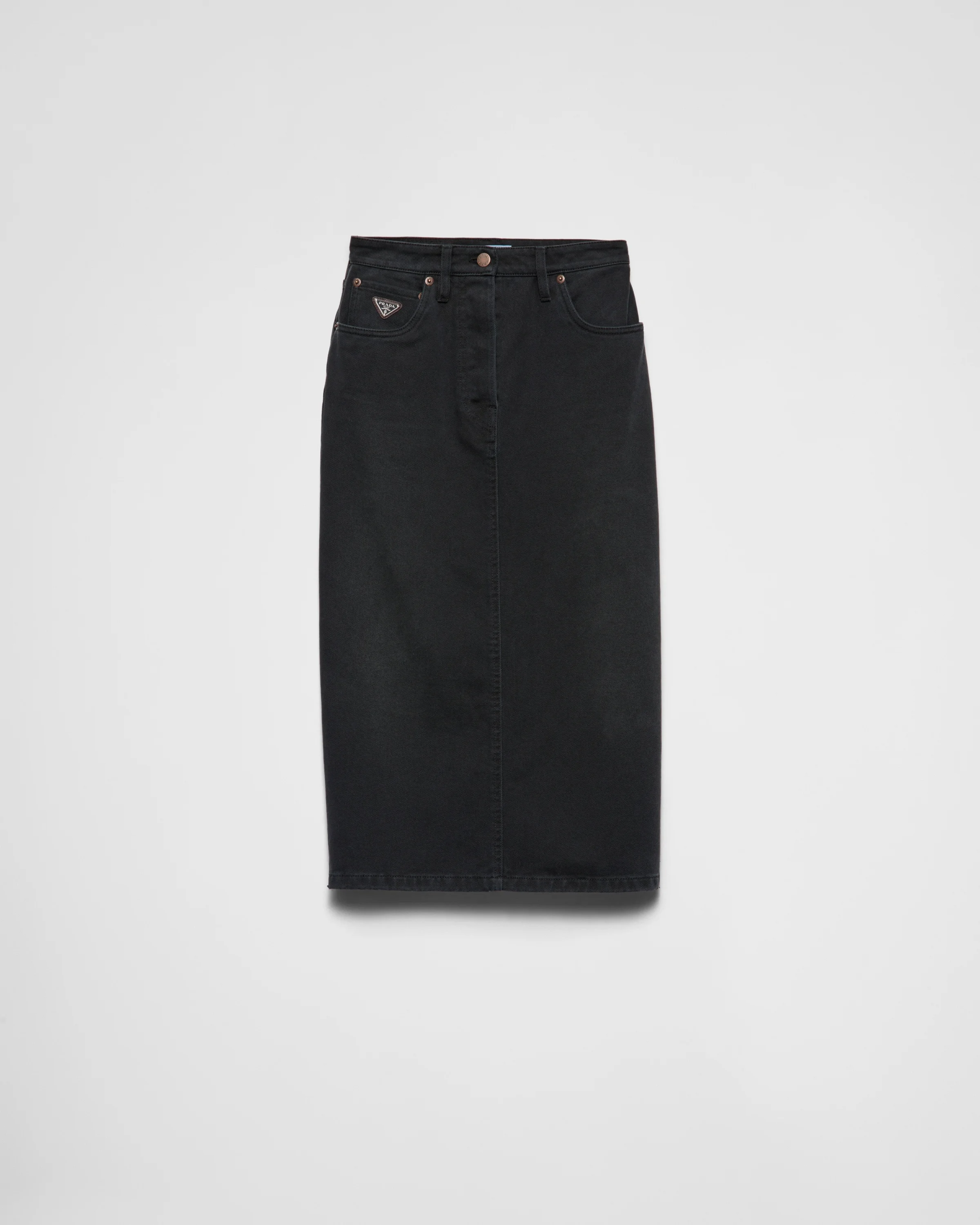 This straight skirt is made of denim with a washed effect. The five-pocket style, defined by a deep slit on the back, is completed by the label decorated with a logo from the archive and from the sleek and iconic geometric shape of the enameled metal triangle logo. - Product code: GFD180_148J_F0557_S_OOO - Garment dyed and washed treatment - Unlined garment - Classic fit - Regular waist - Button closure - Matching stitching - Rounded pockets and small coin pocket - Length from center-back: 80 cm, size: 38 - Triangle logo - Prada Milano logo label on the back - Imported - The model is 180 cm tall and wears a size 38 Height: 80cm MATERIALS Cotton