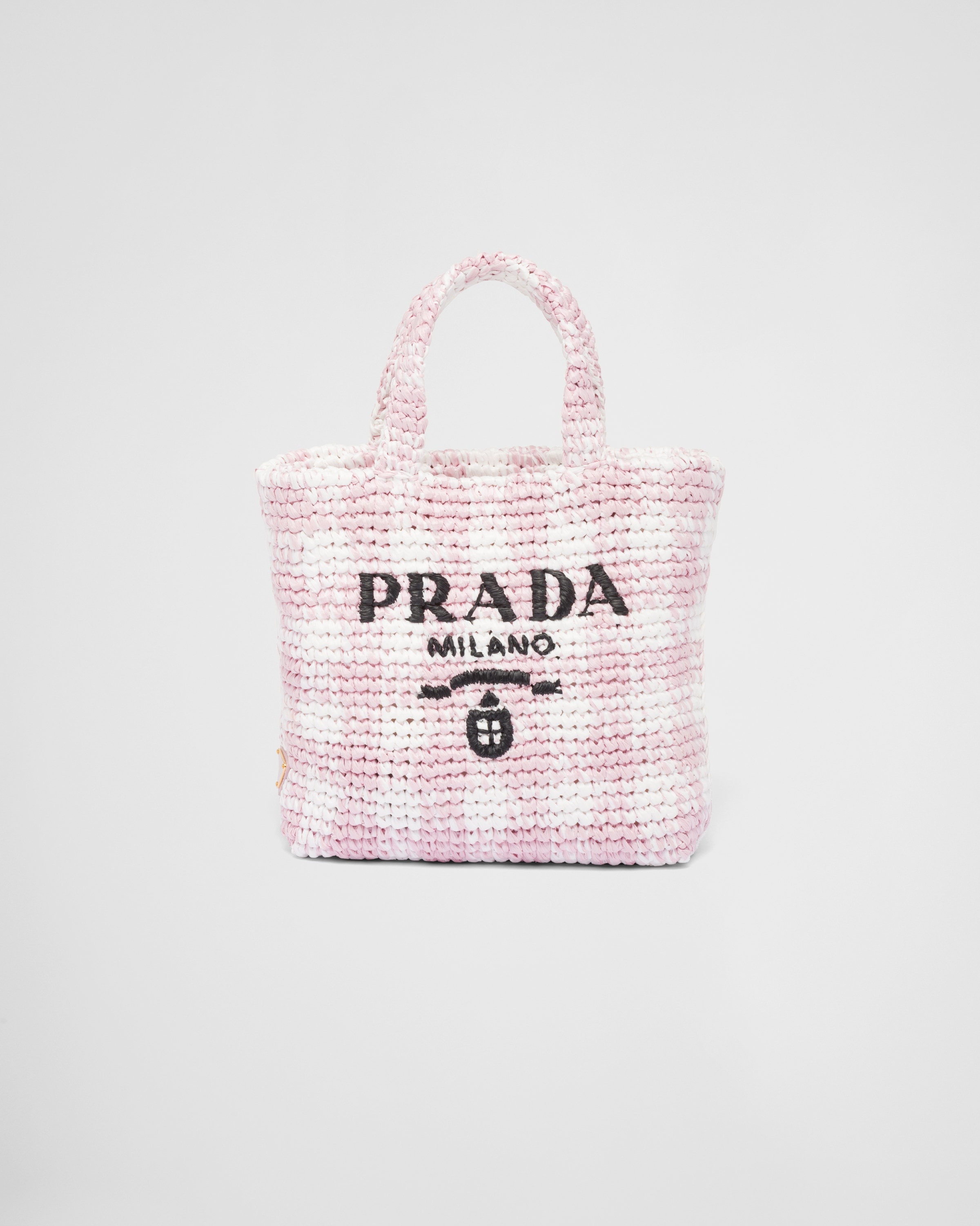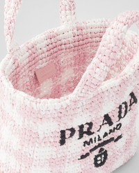 This tote bag with a soft, deconstructed design is made of raffia-effect yarn, a light, natural material with a summery mood. The embroidered lettering logo decorates the front, while the emblematic triangle in enameled metal embellishes the side. - Product code: 1BG422_2A2T_F0E18_V_OOV - Raffia-effect yarn - Crochet workmanship - Embroidered lettering logo - Enameled metal triangle logo on the side - Unlined - Height: 24cm - Width: 24cm - Length: 8cm - Imported MATERIALS See material in product name