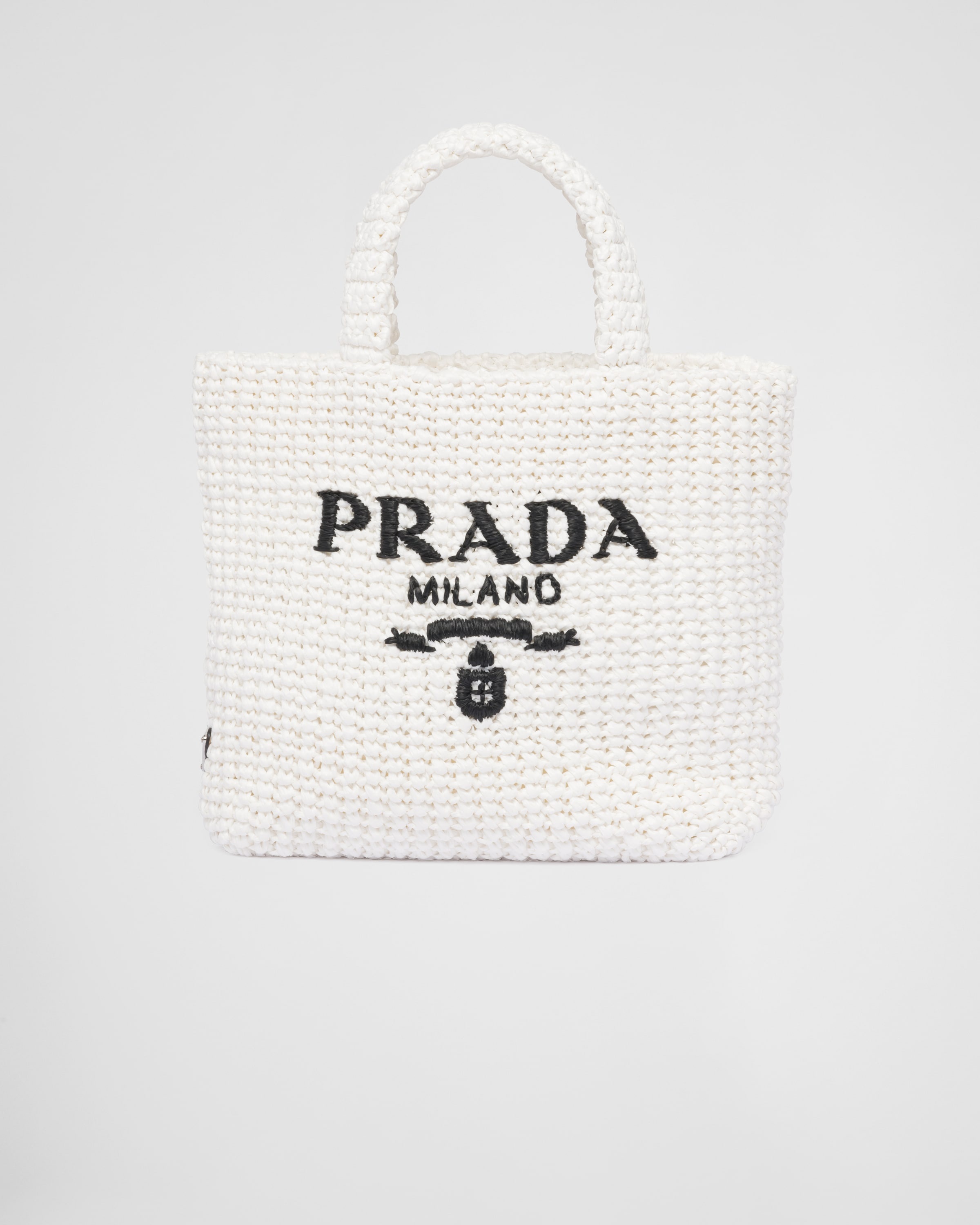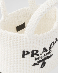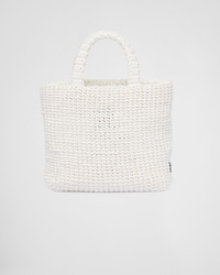This crochet tote bag with a soft, deconstructed design boasts a light and summery mood. The embroidered lettering logo decorates the front, while the emblematic triangle in enameled metal embellishes the side. - Product code: 1BG422_2A2T_F0009_V_OOL - Raffia-effect yarn - Crochet workmanship - Embroidered lettering logo on the front and enameled metal triangle logo on the side - Unlined - Imported Height: 24cm Width: 24cm Length: 8cm MATERIALS See material in product details