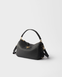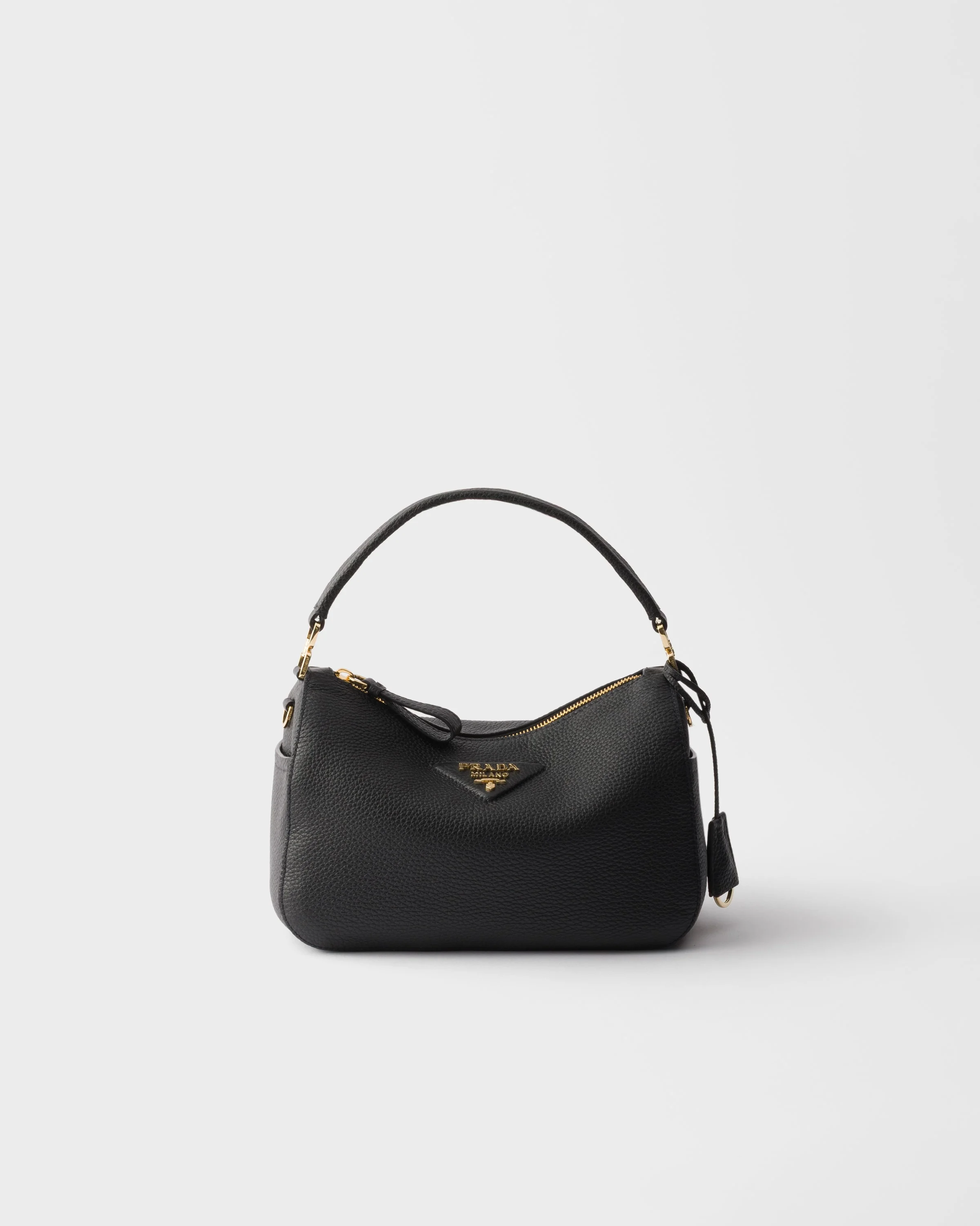 This bag with a soft, compact construction elegantly accompanies everyday life with its versatile and sophisticated design. The style is made of leather with an irregular grain that has a natural effect and pragmatic character. A detachable shoulder strap completes the accessory that has several external pockets and is decorated with the metal lettering logo. - Product code: 1BC277_2DKV_F0632_V_ONO - Leather handle - Detachable, adjustable leather shoulder strap. Maximum length 110 cm - Minimum length: 99 cm - Maximum drop 58 cm - Minimum drop 52 cm - Removable leather key ring - Side pockets - Back zipper pocket - Metal hardware - Metal lettering logo on the front - Zipper closure - Logo-print nylon lining - Imported Height: 15cm Width: 25cm Length: 11cm MATERIALS Main material: Calfskin
