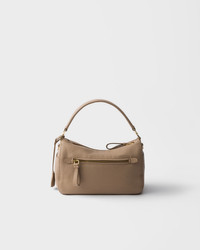 This bag with a soft, compact construction elegantly accompanies everyday life with its versatile and sophisticated design. The style is made of leather with an irregular grain that has a natural effect and pragmatic character. A detachable shoulder strap completes the accessory that has several external pockets and is decorated with the metal lettering logo. - Product code: 1BC277_2DKV_F0MUH_V_ONO - Leather handle - Detachable, adjustable leather shoulder strap. Maximum length 110 cm - Minimum length: 99 cm - Maximum drop 58 cm - Minimum drop 52 cm - Removable leather key ring - Side pockets - Back zipper pocket - Metal hardware - Metal lettering logo on the front - Zipper closure - Logo-print nylon lining - Imported Height: 15cm Width: 25cm Length: 11cm MATERIALS Main material: Calfskin