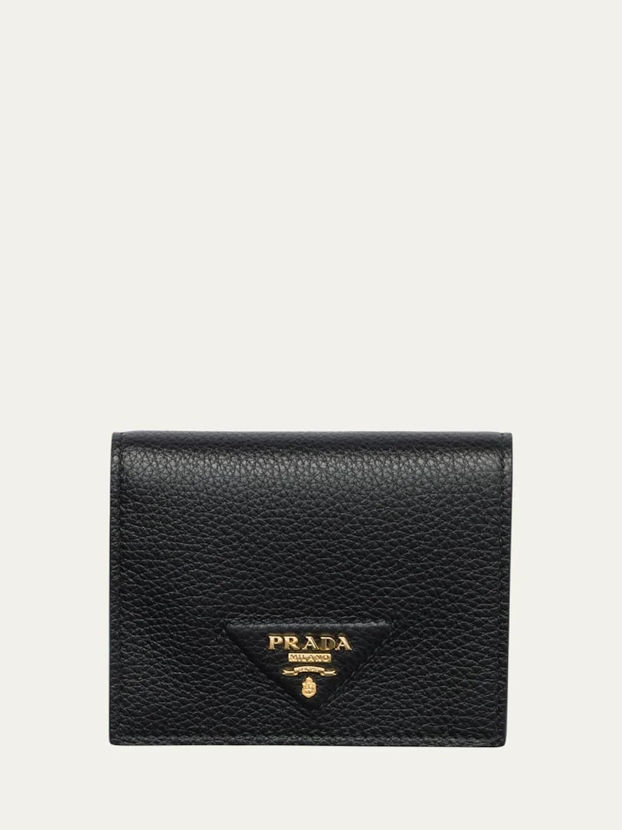 Prada wallet in leather with metal logo lettering. Bifold construction; snap flap closure. Interior, one bill compartment, three card slots, two slip pockets, and one coin flap pouch. 4.5"H x 3.3"W. Made in Italy.