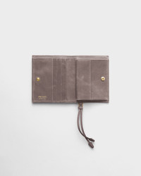 This modern and sophisticated leather wallet is characterized by refined details that enrich the design provided with several pockets and internal coin pocket. - Product code: 1MV204_2CYR_F0116 - Snap closure - Enameled metal triangle logo - One bill compartment - Three card slots - Two internal pockets - Internal zipper coin pocket - Moire and leather lining - Imported Height: 11.2cm Width: 8.5cm MATERIALS Main material: Calfskin