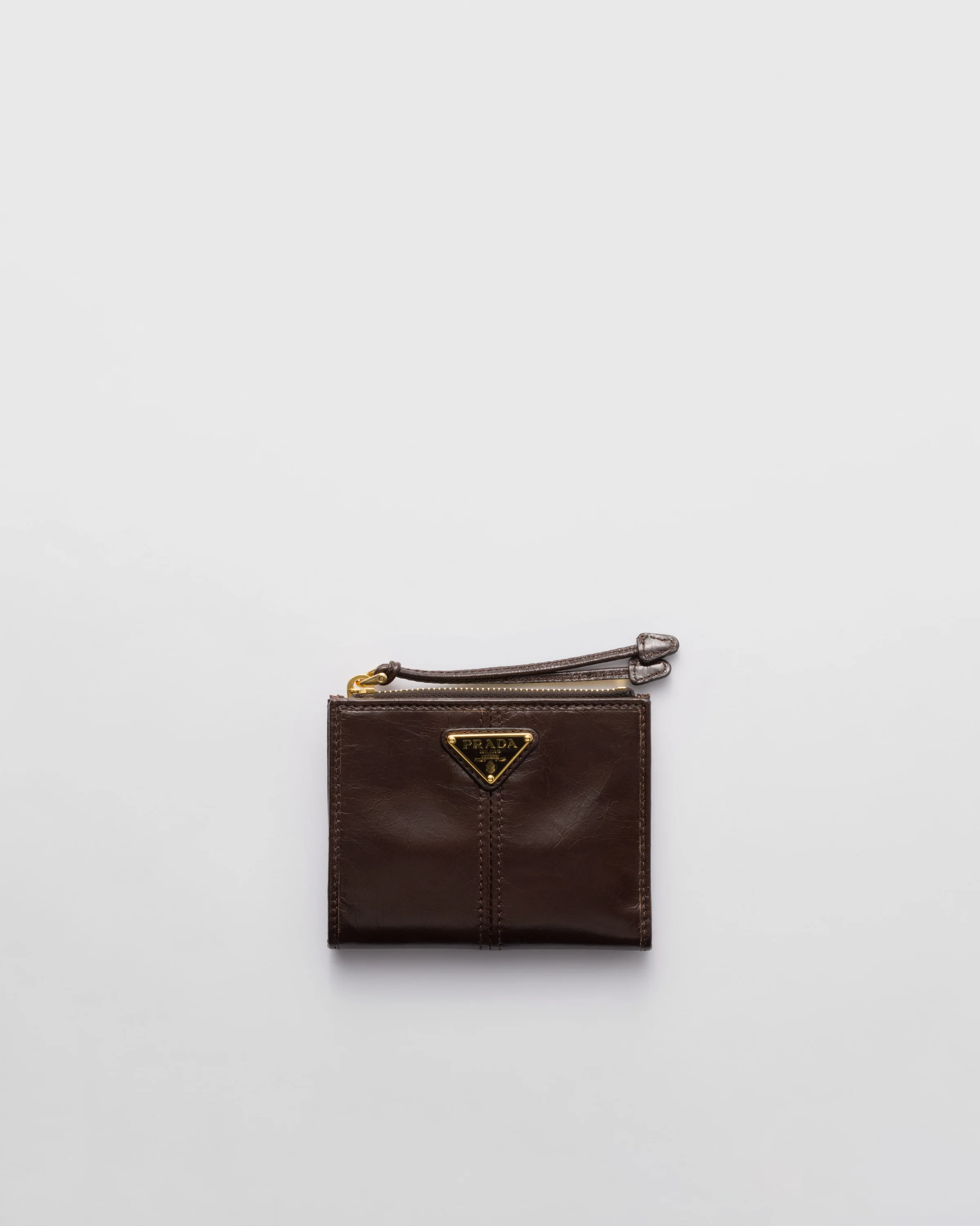 The elegance of leather and the iconic touch of the enamelled metal triangle logo adorn this refined small wallet. The combination of internal compartments and functional details completes the design. - Product code: 1ML050_2CYR_F0003 - Snap closure - Enamelled metal triangle logo - One bill compartment - Six card slots - Two inside pockets - Two interior zipper coin purse - Moire and leather lining - Imported Height: 8.5cm Width: 11.5cm MATERIALS Main material: Calfskin