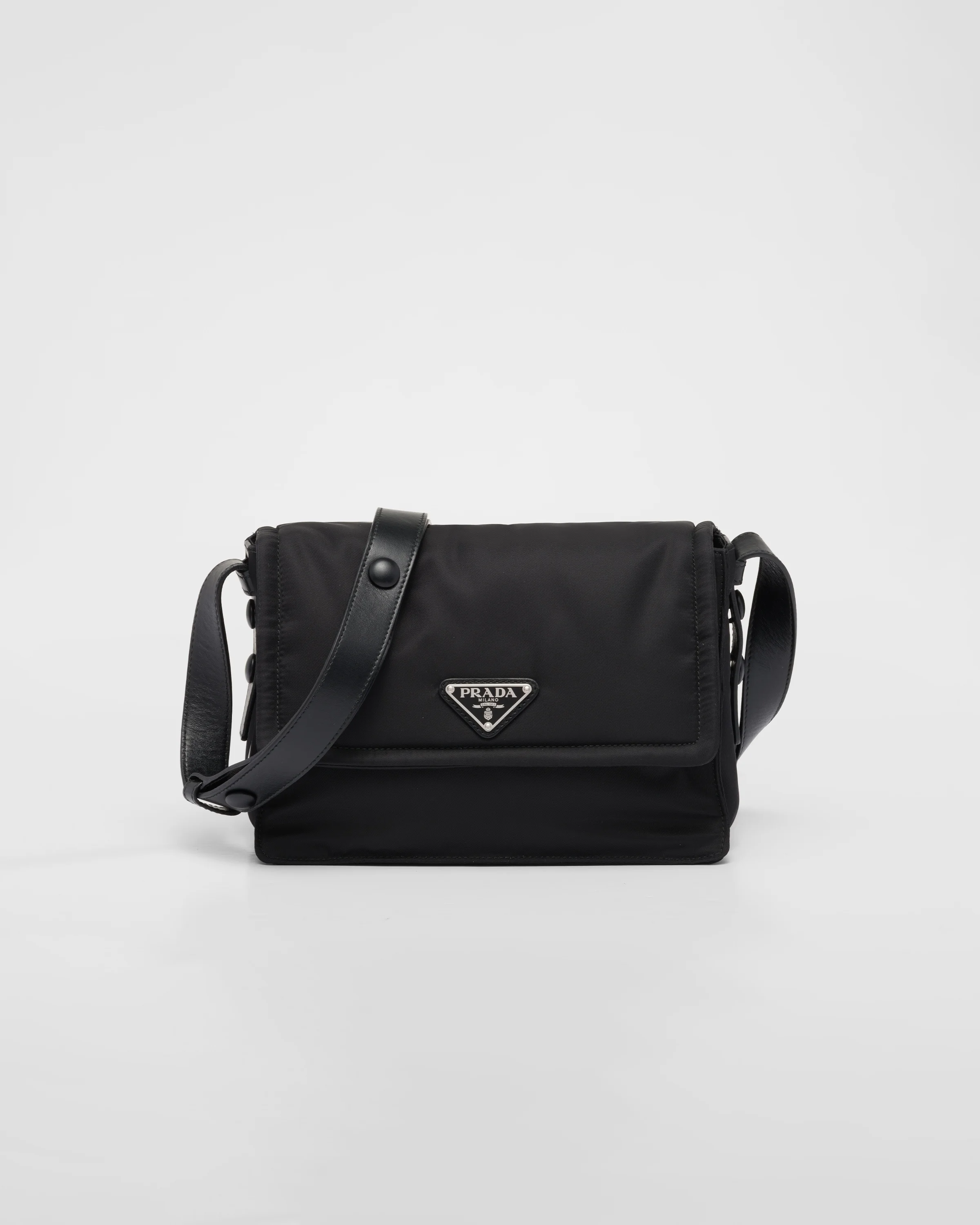 The hybrid concept pervades the Prada narrative and is translated into innovative designs with an interesting and unusual combination of materials, shapes, and functions. This flap bag with a sophisticated, feminine silhouette is reinterpreted in a technologically innovative material: Re-Nylon fabric, made of recycled plastic collected in the ocean. The padding gives the accessory a soft, contemporary look, and the adjustable leather shoulder strap allows it to be worn in different ways. For sustainable care to preserve the product's characteristics and reduce microfiber shedding, we recommend not washing the item too often. Let the product air out after every use and have it dry cleaned at a specialized ecological dry cleaners. - Product code: 1BD313_RDLN_F0002_V_OOO - Adjustable leather shoulder strap - Zipper pocket on the back - Metal hardware - Front enameled metal triangle logo - Magnetic closure - Re-Nylon lining with zipper pocket - Imported Height: 16cm Width: 23cm Length: 11cm MATERIALS Main material: Recycled polyamide
