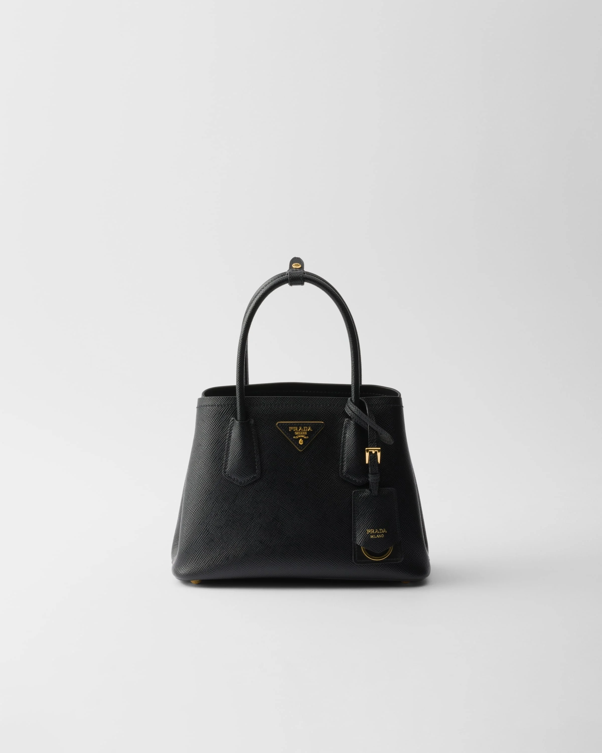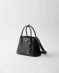 Delicate and refined details give new life to iconic brand designs like the Prada Double handbag, reinterpreted with a compact design. The tonal leather triangle frames the iconic metal lettering logo that gleams on the front, while the detachable shoulder strap makes it possible to also wear as a cross-body or shoulder bag. - Product code: 1BG443_2A4A_F0002_V_XOG - Leather handles - Detachable, adjustable leather shoulder strap, length 105 cm. Maximum length 111 cm - Minimum length 99 cm - Maximum drop 56 cm - Minimum drop 50 cm - Metal hardware - Leather triangle with metal lettering logo on the front - Snap closure on the sides - Nappa leather interior with center flap pocket - With purse feet - Imported Height: 18.5cm Width: 25cm Length: 12.5cm MATERIALS Main material: Calfskin