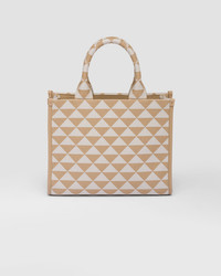Introduced for the first time on trunks designed by Mario Prada, the Prada triangle expresses uniqueness and modernity through its universal, minimalist shape that is reinvented in a different way each season. Here, the geometric design is transformed into a sophisticated yet modernist pattern that plays with contrasting colors and decorates this sleek tote bag. Details in the brand's iconic Saffiano leather embellish the design completed by a detachable shoulder strap that allows it to be worn in different ways. - Product code: 1BA354_2FKL_F0J0A_V_OOM - Saffiano leather details - Embroidered fabric handles - Detachable adjustable 110 cm Saffiano leather shoulder strap - Removable leather keychain - Metal hardware - Enameled metal triangle logo on front - Prada logo-print nylon lining with two pockets, one with zipper - Imported Height: 22cm Width: 28cm Length: 9cm MATERIALS Fabric/Leather