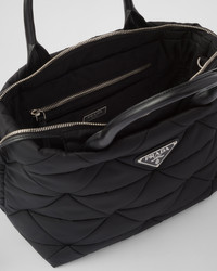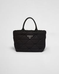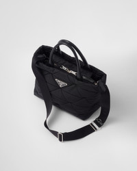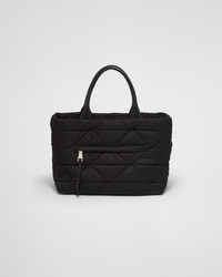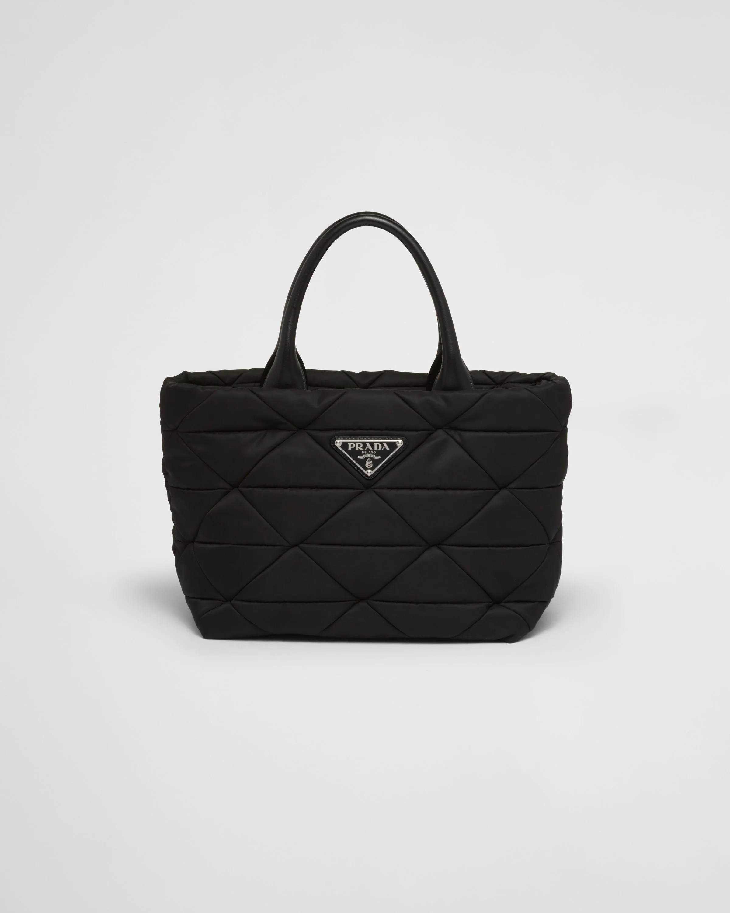 A geometric motif characterizes this quilted tote bag made of Re-Nylon, a fabric produced from recycled and purified plastic materials collected in the ocean. Accented with nappa leather handles and a removable woven tape shoulder strap, the accessory is decorated on the front with the iconic enameled triangle logo. For sustainable care to preserve the product's characteristics and reduce microfiber shedding, we recommend not washing the item too often. Let the product air out after every use and have it dry cleaned at a specialized ecological dry cleaners. - Product code: 1BG436_RDJN_F0002_V_OOO - Padded triangle motif - Nappa leather handles - Detachable adjustable 85 cm logo-print woven tape shoulder strap - Metal hardware - Enameled metal triangle logo on the front - Zipper closure - Logo-print Re-Nylon lining with three pockets, including one with zipper - Imported Height: 22cm Width: 28cm Length: 16cm MATERIALS Main material: Recycled Polyamide