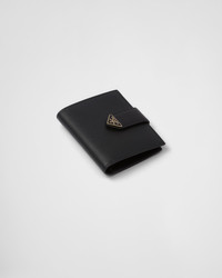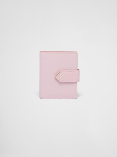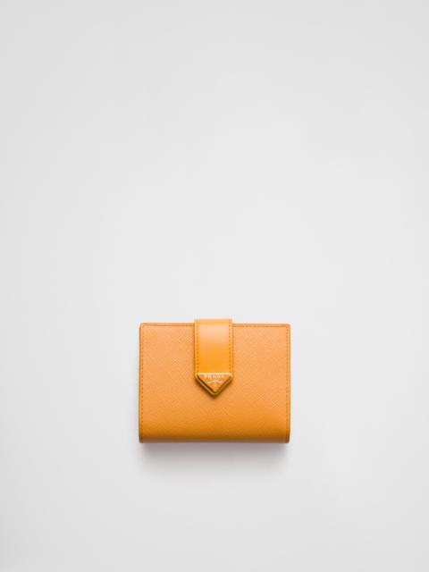 This small wallet with sleek elegance comes in a combination of smooth and Saffiano leather, an iconic Prada material with a crosshatch texture. Characterized by its minimal design and equipped with several compartments and pockets, the accessory is accented with the iconic enameled triangle logo of the brand embellishing the closure. - Product code: 1MV204_2DYG_F0002 - Snap closure - Enameled metal triangle logo - One bill compartment - Three card slots - Two internal pockets - Internal coin compartment with flap - Moire and leather lining - Imported Height: 11.2cm Width: 8.5cm MATERIALS Main material: Calfskin