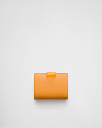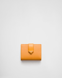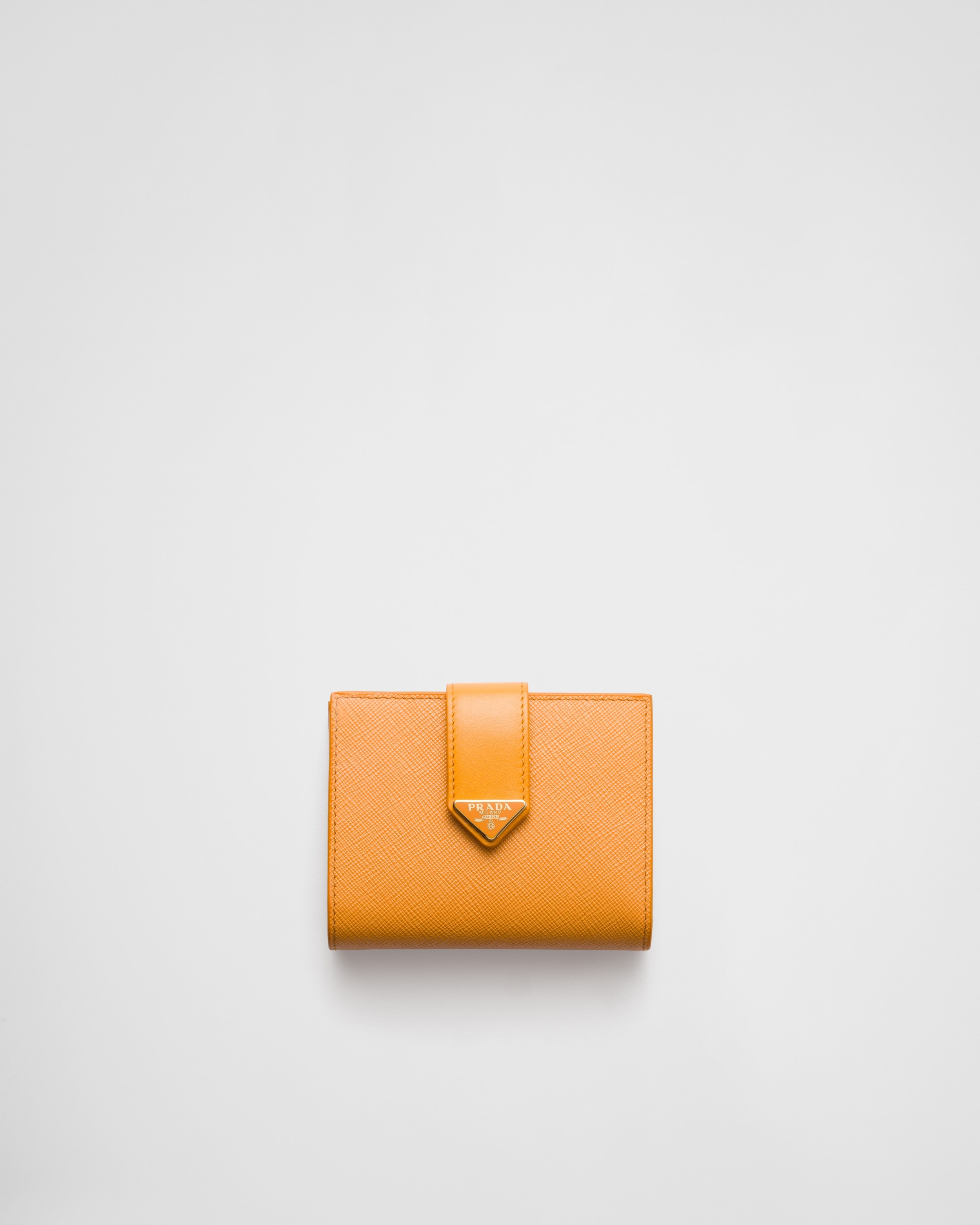 This small wallet with sleek elegance comes in a combination of smooth and Saffiano leather, an iconic Prada material with a crosshatch texture. Characterized by its minimal design and equipped with several compartments and pockets, the accessory is accented with the iconic enameled triangle logo of the brand embellishing the closure. - Product code: 1MV204_2DYG_F0287 - Snap closure - Enameled metal triangle logo - One bill compartment - Three card slots - Two internal pockets - Internal coin compartment with flap - Moire and leather lining - Imported Height: 11.2cm Width: 8.5cm MATERIALS Main material: Calfskin