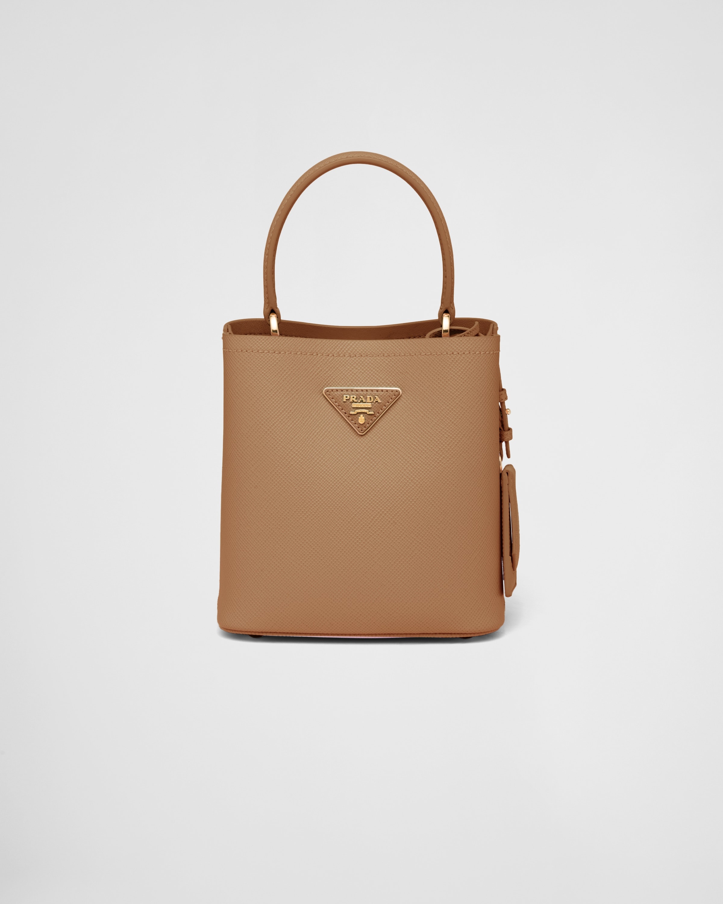 The iconic texture of Saffiano leather characterizes the compact Prada Panier bag. The elegant design of the bag with single handle is distinguished for the strap closure on the top. - Product code: 1BA217_2ERX_F03OE_V_OOO - Leather handle - Detachable and adjustable 105 cm leather shoulder strap - Removable leather name tag - Metal hardware - Metal lettering logo on a leather triangle at the front - Magnet closure - Nappa leather lining with center pocket - Small feet on the bottom - Height: 18cm - Width: 17cm - Length: 10cm - Imported MATERIALS Leather