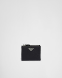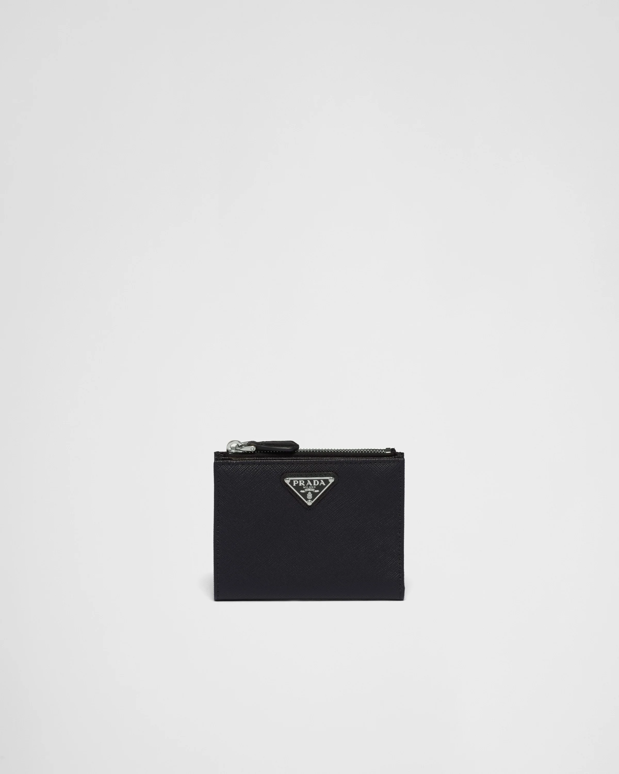 This Saffiano leather wallet with enameled metal triangle logo is sleek and elegant. The accessory with clean lines has a zipper coin compartment, bill compartment, and card slots. - Product code: 1ML050_QHH_F0632 - Snap closure - Enameled metal triangle logo - One bill compartment - Six card slots - Two internal pockets - Internal zipper coin compartment - Moire and Saffiano leather lining - Imported Height: 8.5cm Width: 11.5cm MATERIALS Main material: Calfskin