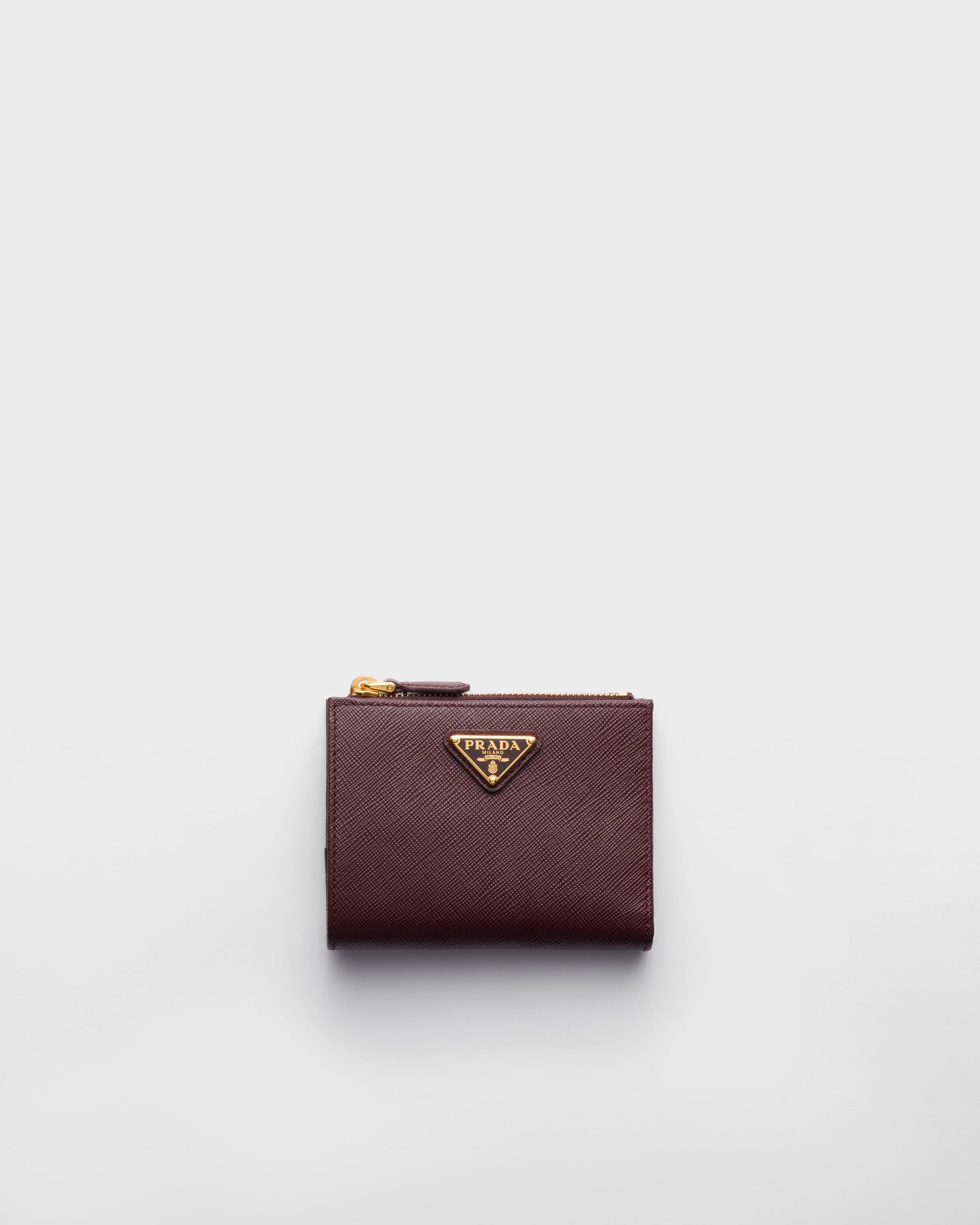 This Saffiano leather wallet with enameled metal triangle logo is sleek and elegant. The accessory with clean lines has a zipper coin compartment, bill compartment, and card slots. - Product code: 1ML050_QHH_F0007 - Snap closure - Enameled metal triangle logo - One bill compartment - Six card slots - Two internal pockets - Internal zipper coin compartment - Moire and Saffiano leather lining - Imported Height: 8.5cm Width: 11.5cm MATERIALS Main material: Calfskin