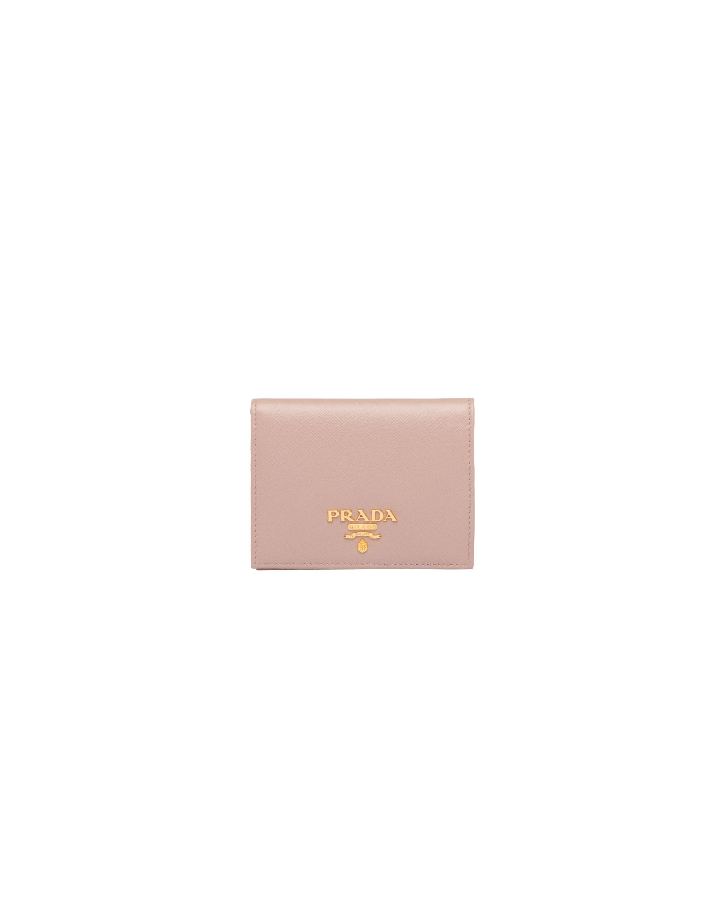 This monochrome wallet in fine Saffiano leather has an elegant minimalist design enhanced by the lustrous gold-tone lettering logo. There are several compartments and pockets inside. - Product code: 1MV204_QWA_F0236 - Snap fastener - Metal lettering logo - One bill compartment - Three card slots - Two internal pockets - Internal coin pocket with flap - Moire and Saffiano leather lining - Imported Height: 11.2cm Width: 8.5cm MATERIALS Main material: Calfskin