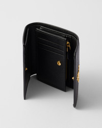 This Saffiano leather wallet with the metal logo on the front flap has a compact, modern design. - Product code: 1MH025_QWA_F0002 - Snap fastener - Metal lettering logo - One bill compartment - Six card slots - Two internal pockets - Internal coin pocket with zipper - Moire and Saffiano leather lining - Imported Height: 9.5cm Width: 12cm MATERIALS Main material: Calfskin