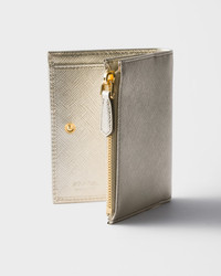 This Saffiano leather wallet with enameled metal triangle logo is sleek and elegant. The accessory with clean lines has a zipper coin compartment, bill compartment, and card slots. - Product code: 1ML050_QHH_F0846 - Snap closure - Enameled metal triangle logo - One bill compartment - Six card slots - Two internal pockets - Internal zipper coin compartment - Moire and Saffiano leather lining - Imported Height: 8.5cm Width: 11.5cm MATERIALS Main material: Calfskin