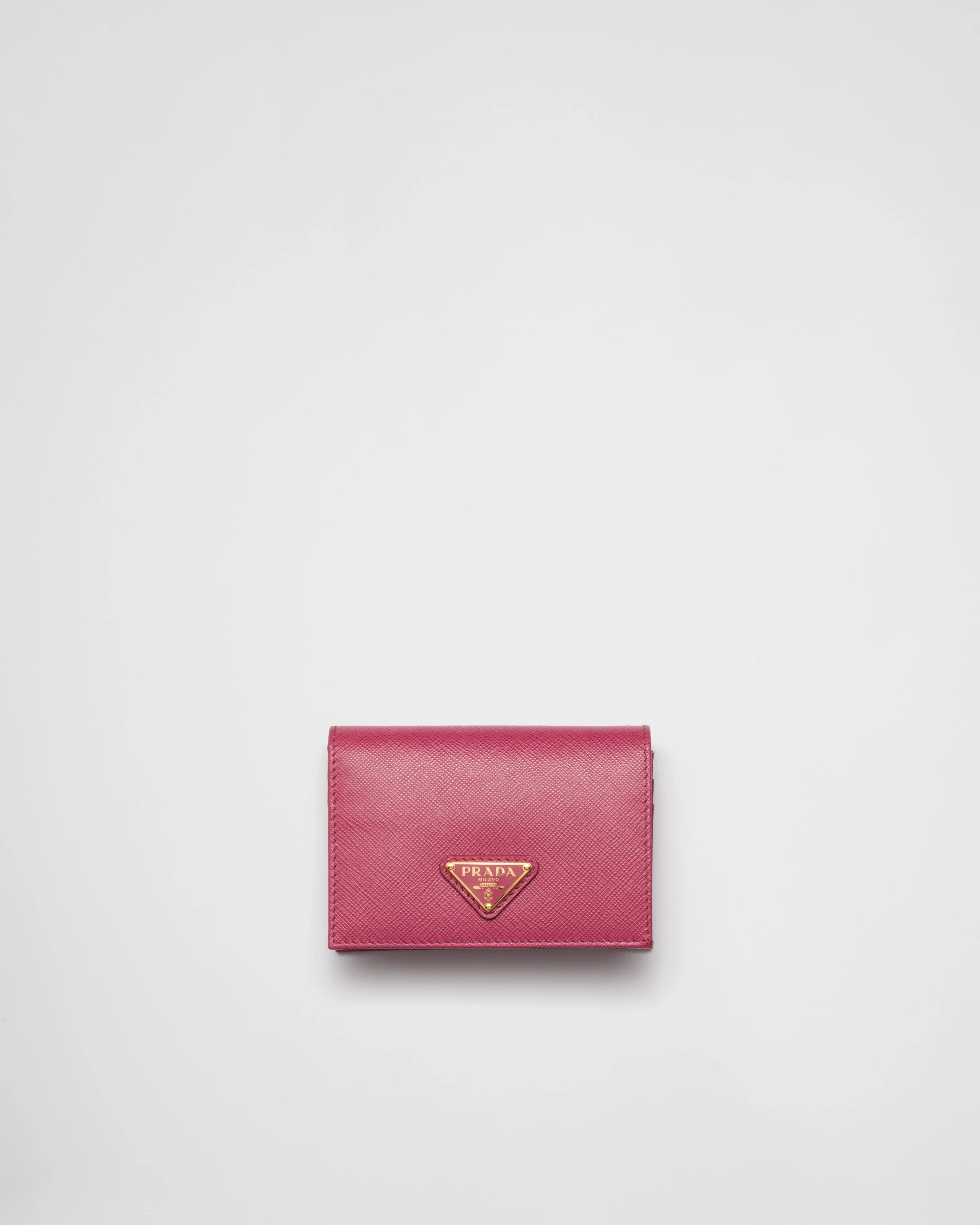This Saffiano leather wallet with enameled metal triangle logo expresses sleek elegance. The accessory with clean lines has a zipper coin compartment, bill compartment, and four card slots. - Product code: 1MV021_QHH_F0BQT - Snap fastener - Enameled metal triangle logo - One bill compartment - Four card slots - Two internal pockets - Internal coin pocket with zipper - Moire and Saffiano leather lining - Imported Height: 11.2cm Width: 8.5cm MATERIALS Main material: Calfskin