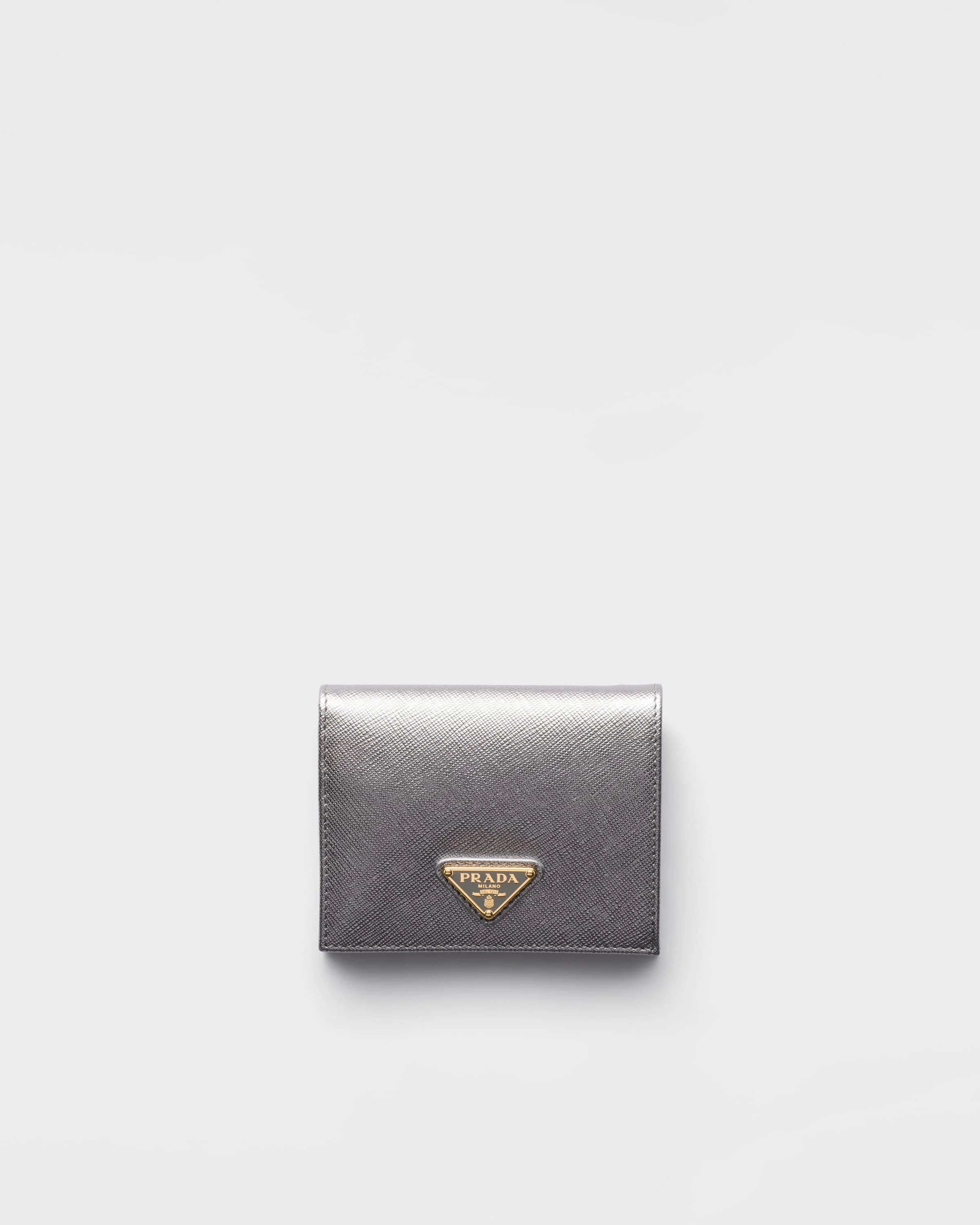This luxurious Saffiano leather wallet is sheer elegance in a compact form. The accessory has several document pockets, credit card slots and bill compartment. Metal logo. - Product code: 1MV204_QHH_F0135 - Snap fastener - Enameled metal triangle logo - One bill compartment - Three card slots - Two internal pockets - Internal coin pocket with flap - Moire and Saffiano leather lining - Imported Height: 11.2cm Width: 8.5cm MATERIALS Main material: Calfskin