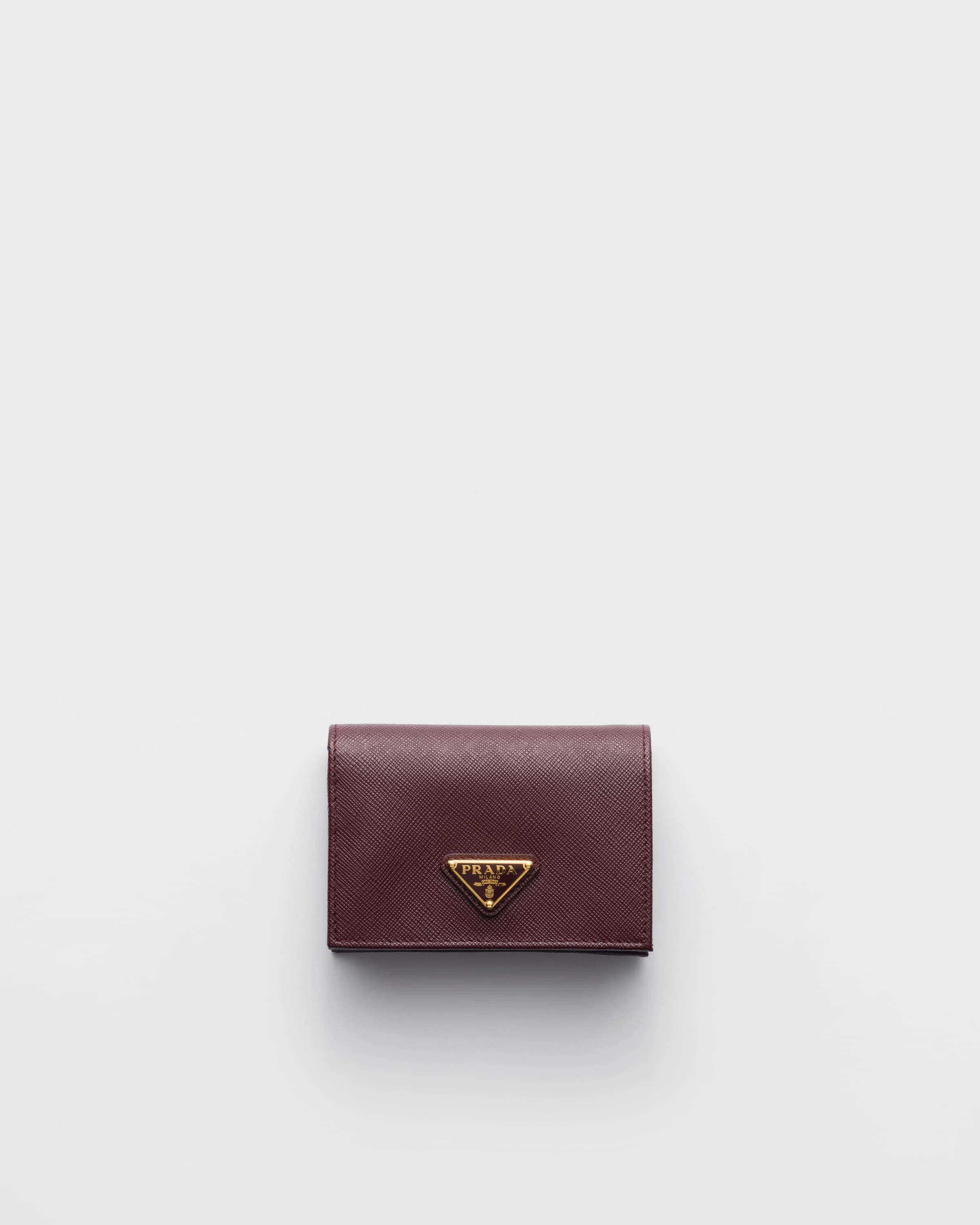 This Saffiano leather wallet with enameled metal triangle logo expresses sleek elegance. The accessory with clean lines has a zipper coin compartment, bill compartment, and four card slots. - Product code: 1MV021_QHH_F0007 - Snap fastener - Enameled metal triangle logo - One bill compartment - Four card slots - Two internal pockets - Internal coin pocket with zipper - Moire and Saffiano leather lining - Imported Height: 11.2cm Width: 8.5cm MATERIALS Main material: Calfskin