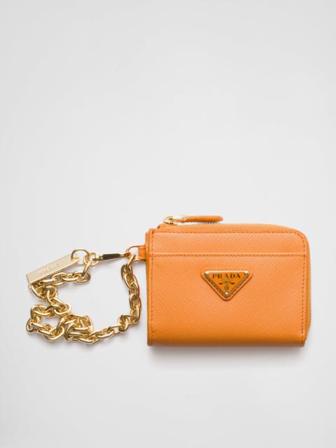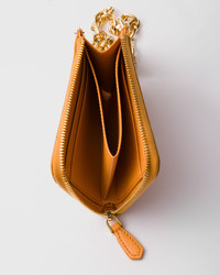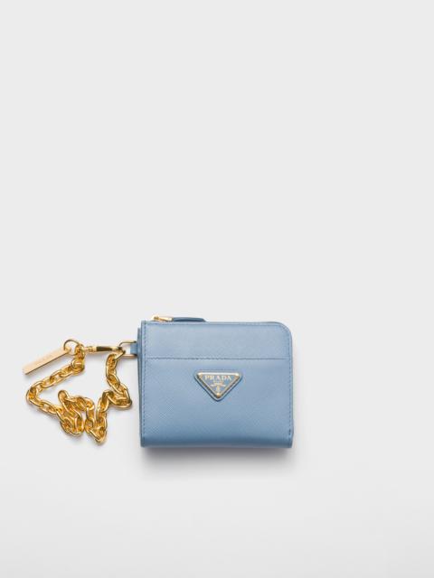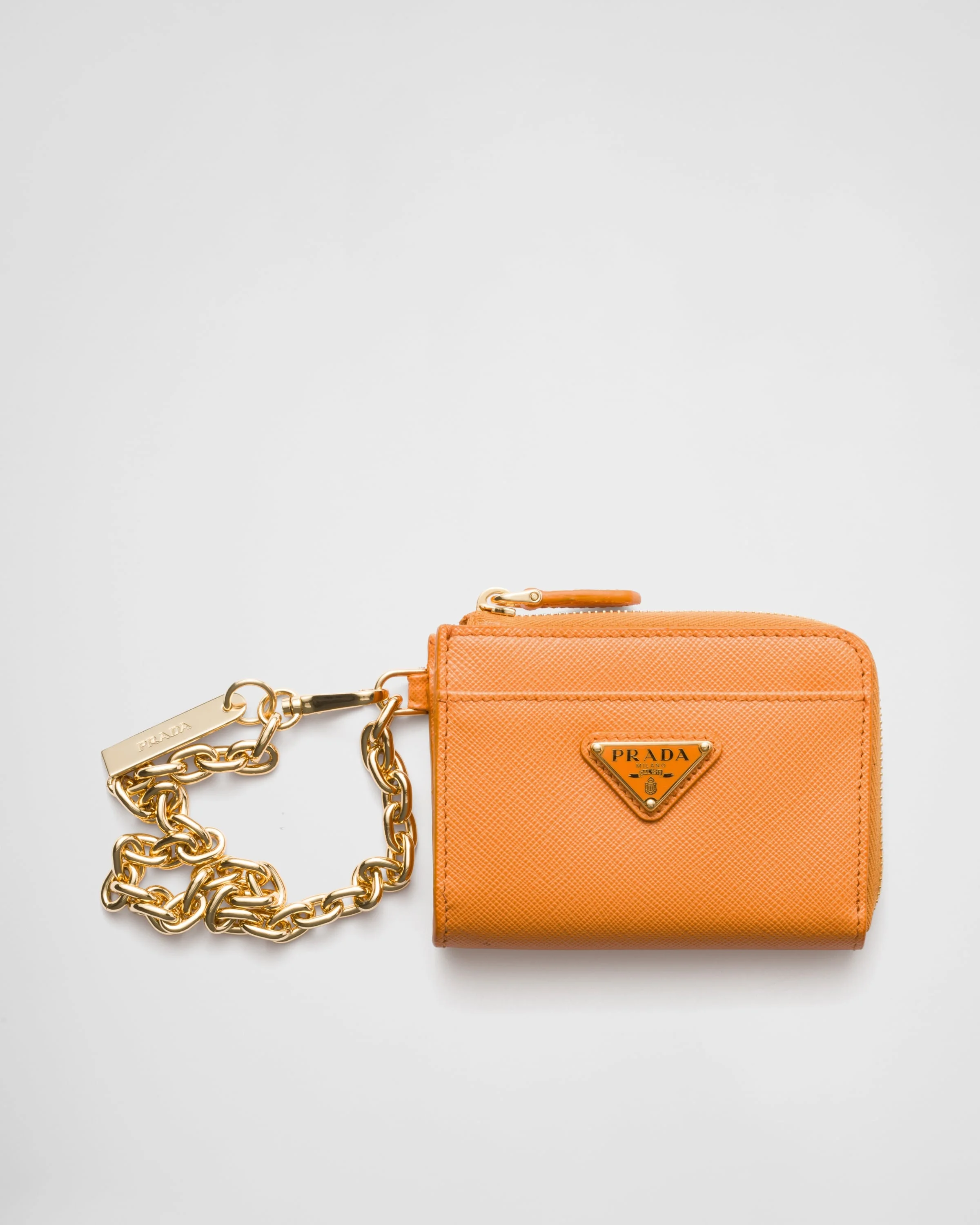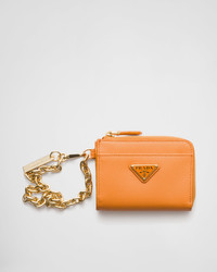 The unmistakable texture of Saffiano leather reflects the elegant and pragmatic character of this small zipper wallet. The accessory combines refined details with a compact yet versatile design, completed by a elegant chain wristlet. - Product code: 1ML061_QHH_F0287 - Enameled metal triangle logo - One bill compartment - Four card slots - One external pocket - Moire and Saffiano leather lining - Chain wristlet with snap-hook - Imported Height: 9cm Width: 11cm MATERIALS Main material: Calfskin