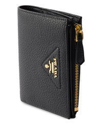 small textured leather wallet Highlights - Black - Triangle logo - Zip closure - Gold-tone hardware - Card slots - Compact design Composition Outer: Calf Leather 100% SIZE & FIT Measurement LENGTH 3.34 in(8.5 cm) WIDTH 4.52 in(11.5 cm)