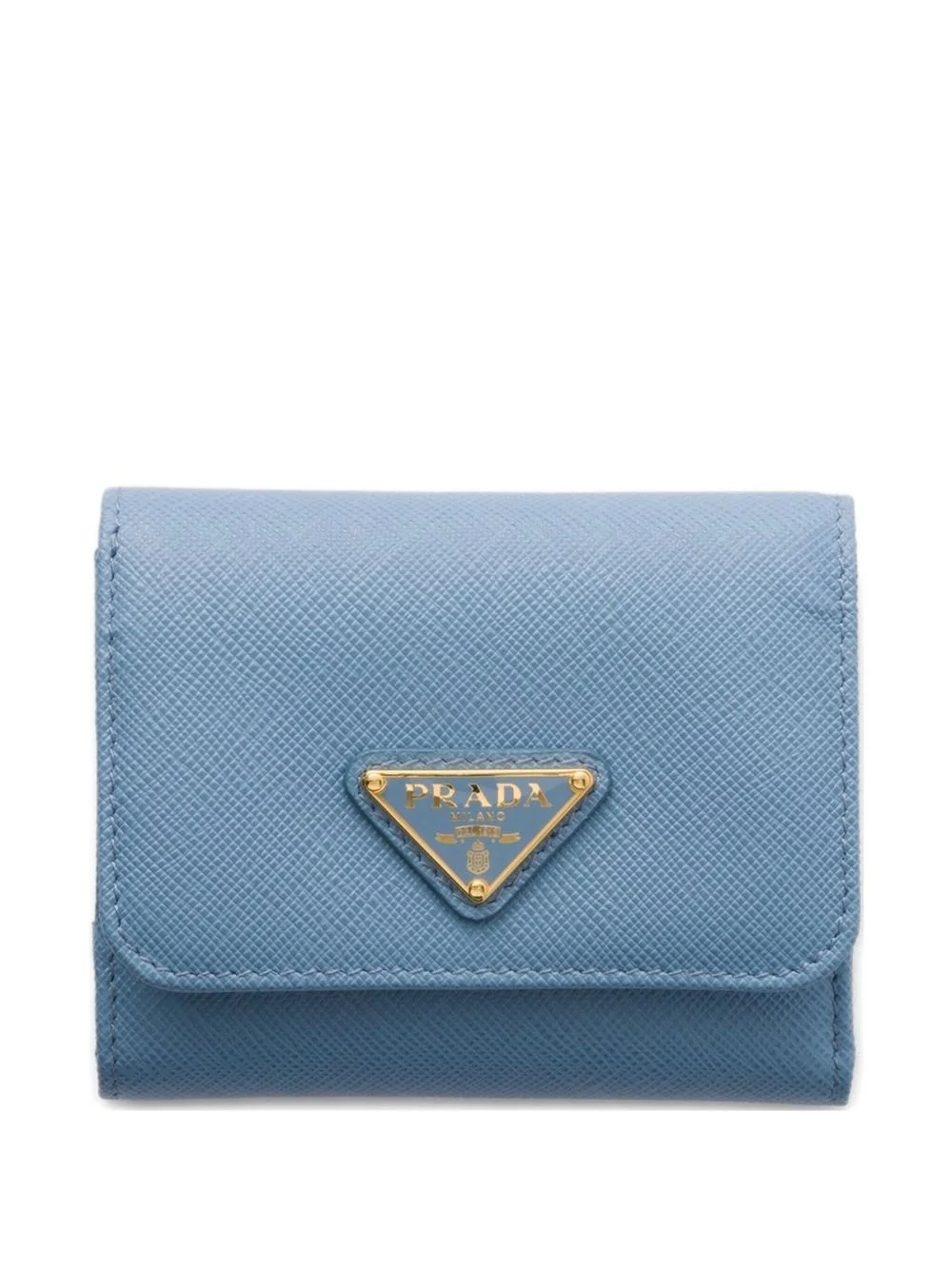 small triangle-logo leather wallet Highlights - Light blue - Enameled metal triangle logo - Snap closure - One bill compartment - Four card slots - One external pocket Composition Lining: Saffiano Leather 100% Outer: CALFSKIN 100%