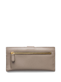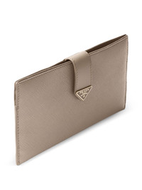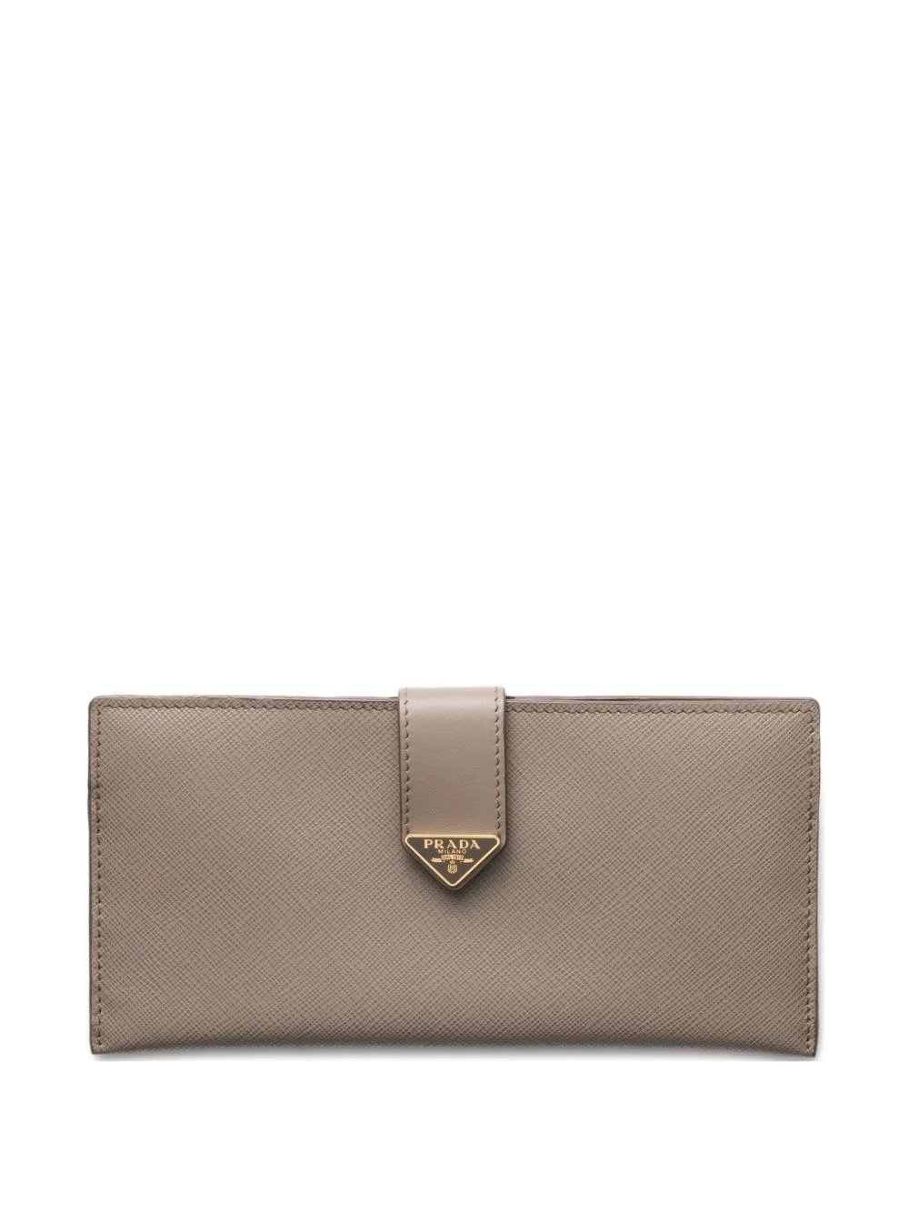 snap triangle-logo leather wallet Highlights - Grey - Enamel triangle logo - Snap fastening - Eight card slots - External zip pocket Composition Outer: Saffiano Leather 100% SIZE & FIT Measurement LENGTH 7.67 in(19.5 cm) WIDTH 3.74 in(9.5 cm)