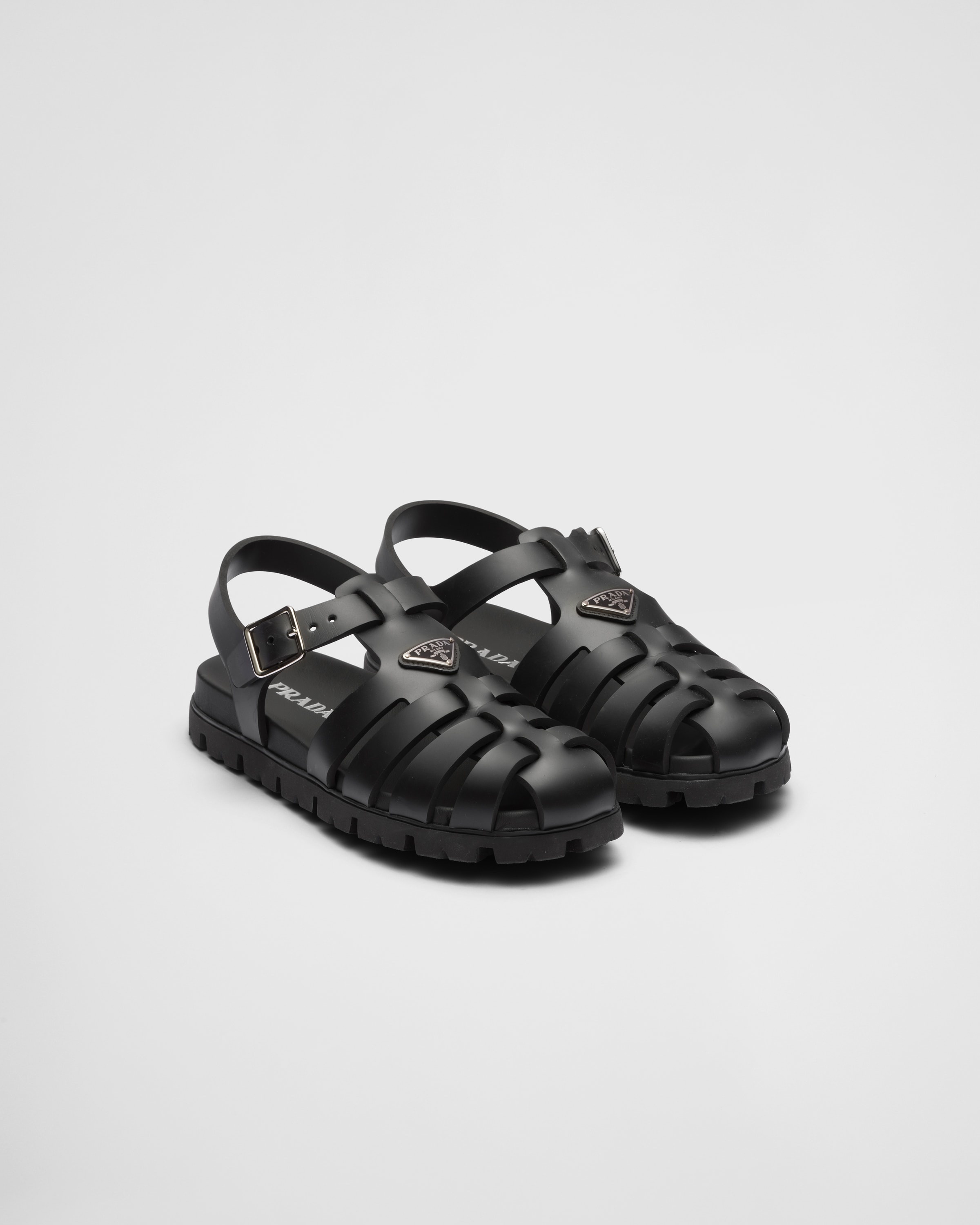These sporty sandals reinterpret a retro beach silhouette with contemporary lines and details. The rubber style is completed by the enameled metal triangle logo, the iconic signature of Prada collections. - 商品代號: 1X465N_3LKK_F0002_F_020 - Upper with metal buckle - Enameled metal triangle logo - Rubber sole: 20 mm - Lug sole