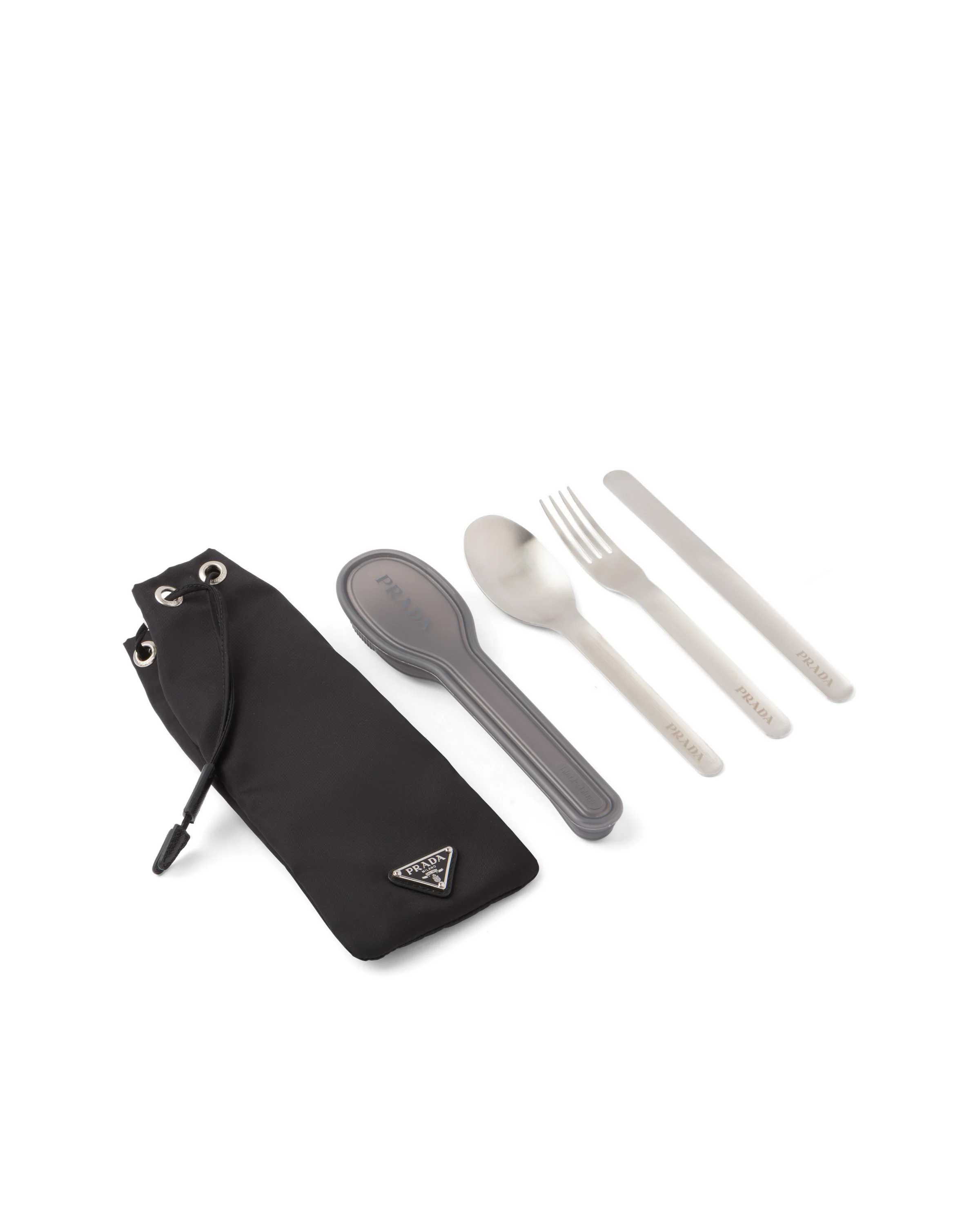 This stainless steel cutlery set is part of a lineup of lifestyle accessories designed for nature lovers and fans of outdoor activities. Presented alongside a wide range of picnic accessories, the set comes in a pouch made of Re-Nylon, an innovative material produced from purified, recycled plastic collected in the ocean. The enameled metal triangle logo adds an iconic note. For sustainable care to preserve the product's characteristics and reduce microfiber shedding, we recommend not washing the item too often. Let the product air out after every use and have it dry cleaned at a specialized ecological dry cleaners. - Product code: 2UP005_2DMI_F0002_V_OOO - Re-Nylon pouch - Enameled metal triangle logo - Imported Height: 22cm Width: 10cm MATERIALS Fabric