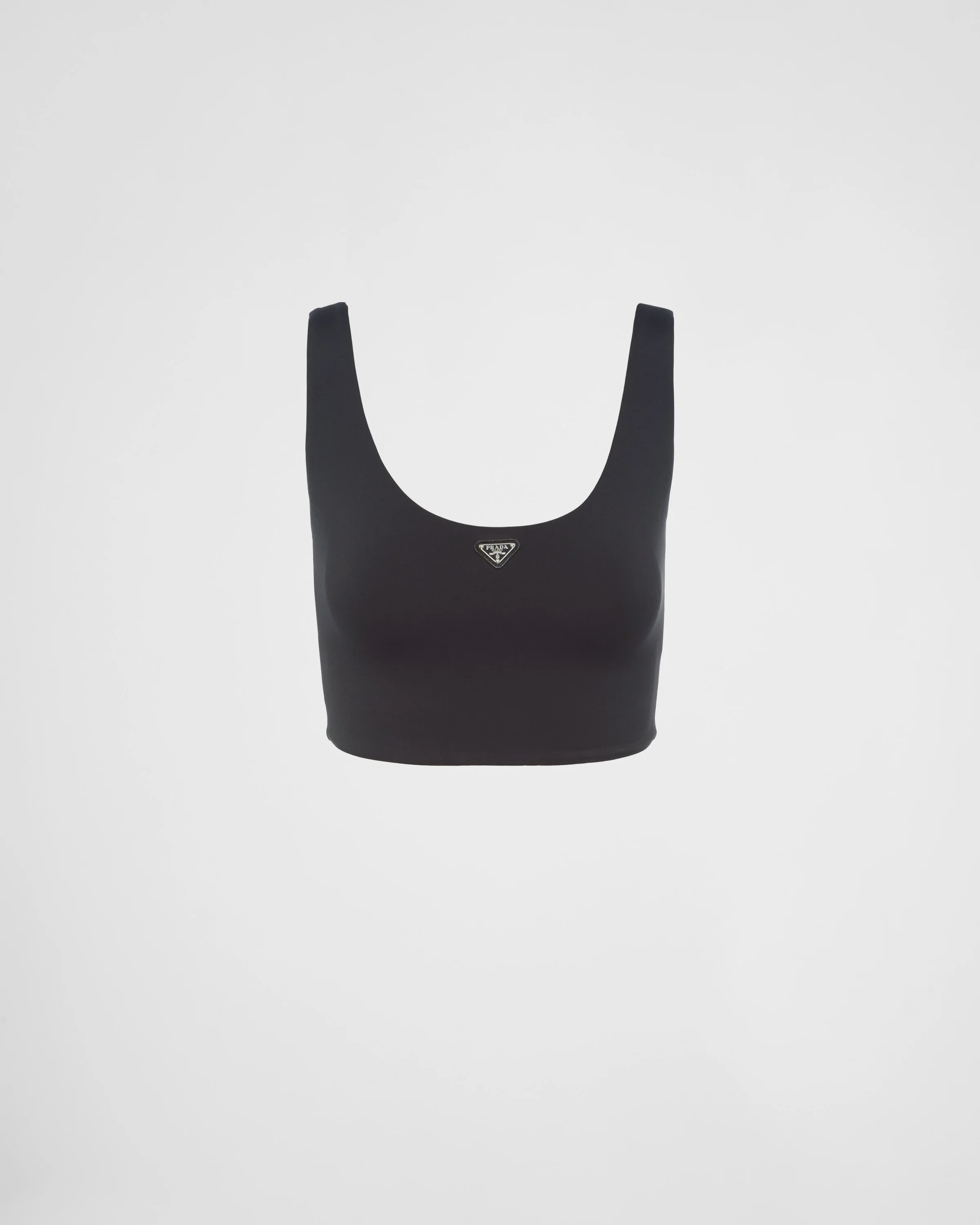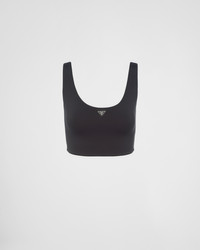 A design inspired by sportswear characterizes this stretch jersey top. Defined by a slim fit and scoop neck, the garment is decorated with the Saffiano leather triangle logo that adds a delicate element of identification. - Product code: 39535_1068_F0002_S_221 - Slim fit - Scoop neck - Sleeveless - Saffiano leather triangle logo - Straight hem - Imported Height: 38cm MATERIALS Main material: 15% elastane 85% recycled polyester