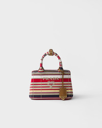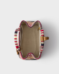 Timeless codes of nautical style inspire the design of this canvas mini-bag, a reinterpretation of an iconic style with contemporary allure. The accessory animated by multicolored stripes is completed with leather trim that underlines its refined, versatile character. - Product code: 1BA038_2HJO_F0853_V_8OY - Canvas handles - Detachable, adjustable logo-print woven tape shoulder strap. Maximum length cm 105 cm - Minimum length 66 cm - Maximum drop 54 cm - Minimum drop 35 cm - Removable leather key ring - Metal hardware - Embroidered logo on the front and enameled metal triangle logo on the key ring - Snap closure on the sides - Linen blend lining with two pockets, including one with zipper - With small purse feet - Imported Height: 15cm Width: 22cm Length: 13cm MATERIALS Main material: Calfskin