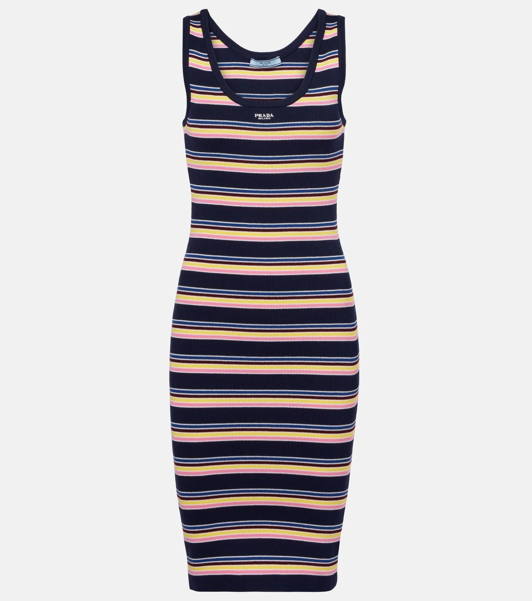 Pack this midi dress from Prada for your next warm-weather escape. Cut to hug the figure, it's knitted from cotton with a multicolored striped pattern and detailed with the brand's logo on the front. Product Details - Material: 100% cotton - Care instructions: dry clean - Made in Italy - Designer color name: Bleu - Item color: multicolor, blue - Item number: P01009305 Size & Fit - True to size - Fitted - Non-stretchy fabric - The model seen in the picture is 178cm-5'10" and wearing a size IT 40