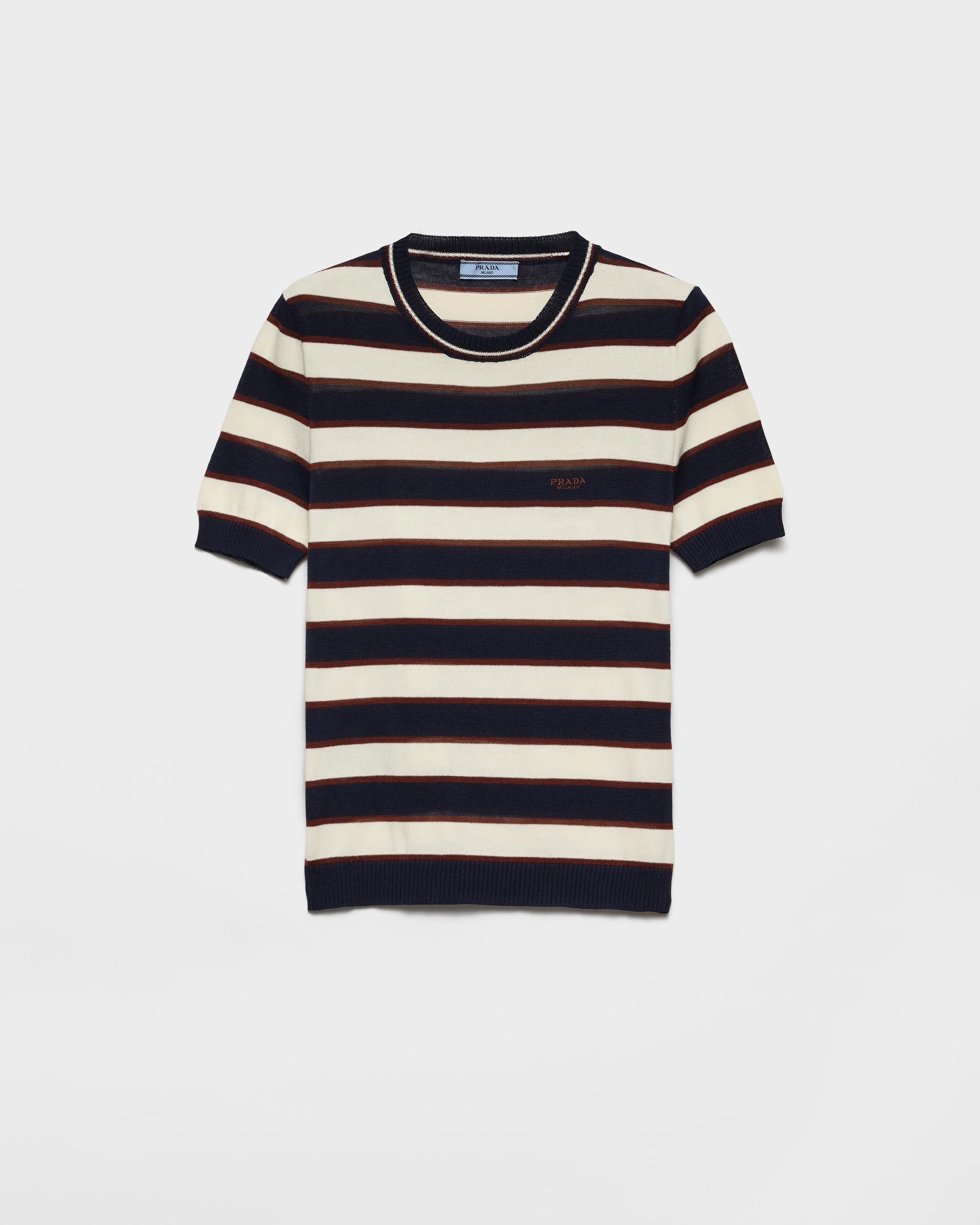 A stripe motif with vintage allure animates this short-sleeved slim fit sweater. The cotton garment is decorated with the embroidered lettering logo on the front. - Product code: P24S2H_17KK_F056H_S_OOO - Short sleeves - Plain knit - Slim fit - Ribbed knit crew-neck - Regular shoulder - Ribbed knit sleeve trim and hem - Embroidered logo - Imported - The model is 180 cm tall and wears a size 38 Height: 50cm MATERIALS Main material: 100% cotton