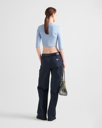 This striped top with timeless charm is made of soft jersey with a slim fit. The style with crew neck and three-quarter sleeves is embellished with the iconic enameled metal triangle logo. - 商品货号: 39578_14O3_F0D9K_S_OOO - Slim fit - Crew-neck - Three-quarter sleeves - Enameled triangle logo on Saffiano leather base - 产品标签信息 - The model is 178 cm tall and wears a size 38 高度: 38cm MATERIALS Cotton