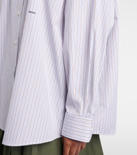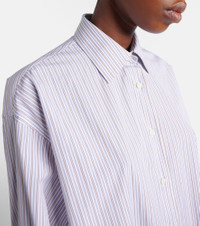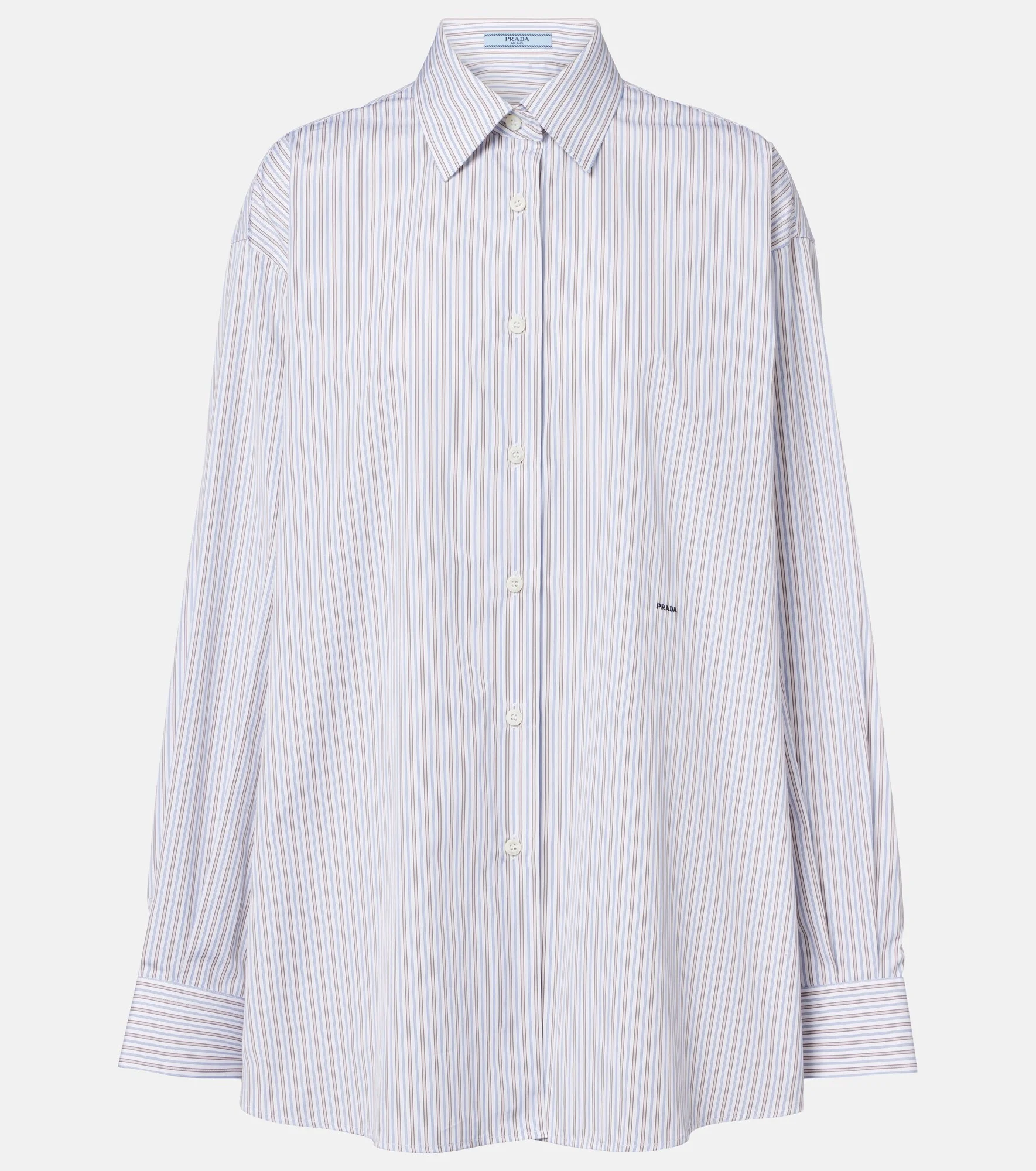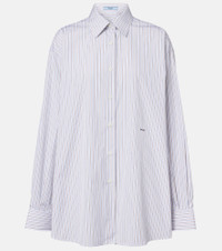 Prada takes Italian heritage into a distinctly modern direction with a streamlined and fashion-forward approach. Shaped into a relaxed, oversized silhouette, this shirt is made from pure cotton poplin with all-over stripes and subtle logo detailing. Product Details - Material: 100% cotton - Care instructions: hand wash - Made in Romania - Color: white - Designer color name: Tabacco+Blu - Closure: buttoned placket - Contains non-textile parts of animal origin - Cuff: two buttons - Collar: classic (Straight point) - Item number: P01154906 Size & Fit - True to size - Dropped shoulders - Oversized - Non-stretchy fabric - Falls below the hip - The model seen in the picture is 178cm-5'10" and wearing a size IT 40