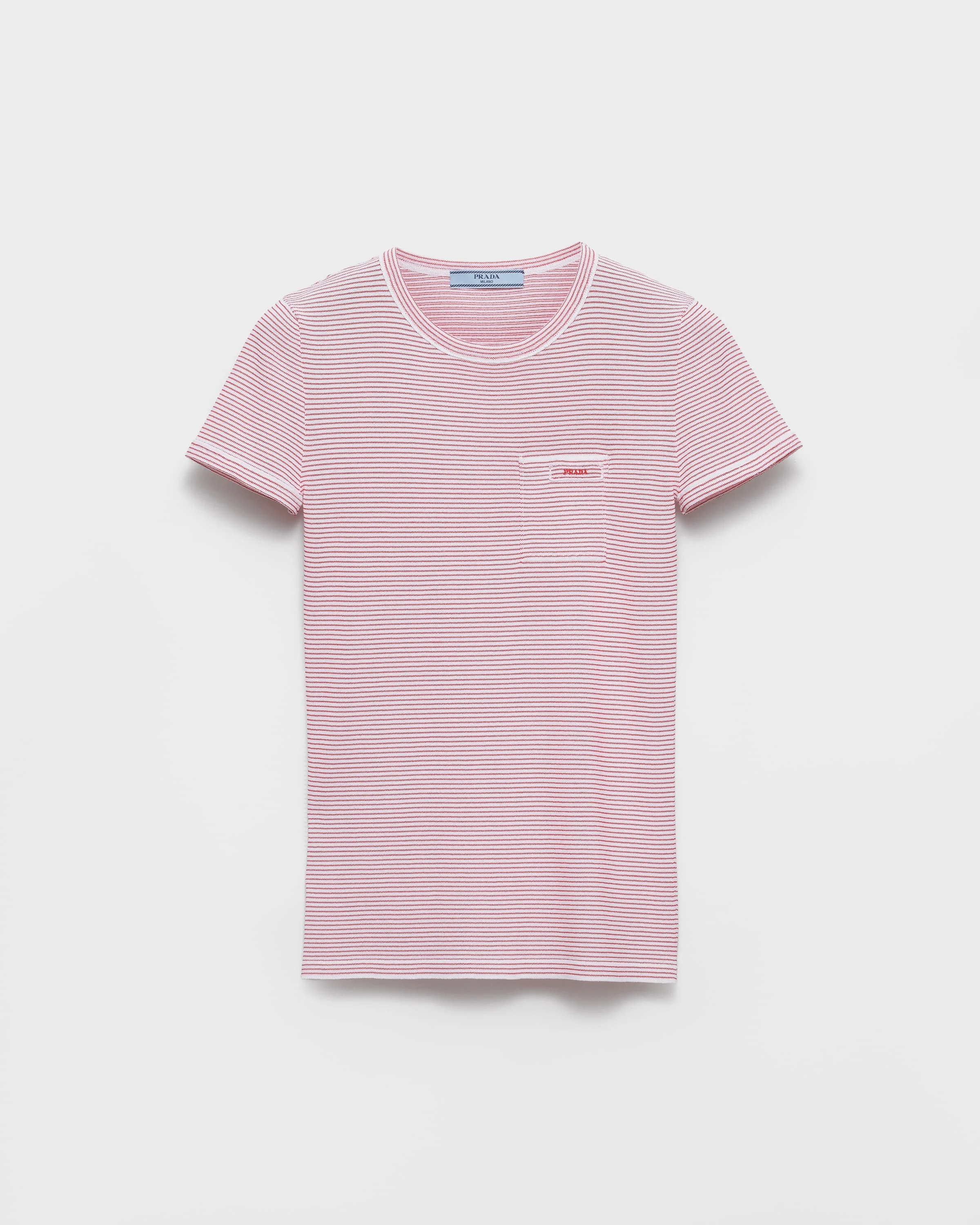 Sleek lines and sporty details define this short-sleeved sweater with a slim fit silhouette. The style, animated by a stripe motif, is decorated with the embroidered lettering logo. - Product code: P24R2G_17IM_F0970_S_OOO - Short sleeves - Plain knit - Slim fit - Ribbed knit crew-neck - Regular shoulder - Ribbed knit sleeve trim and hem - Embroidered logo - Small breast pocket - Imported - The model is 176 cm tall and wears a size 38 Height: 57cm MATERIALS Main material: 4% polyester 96% viscose