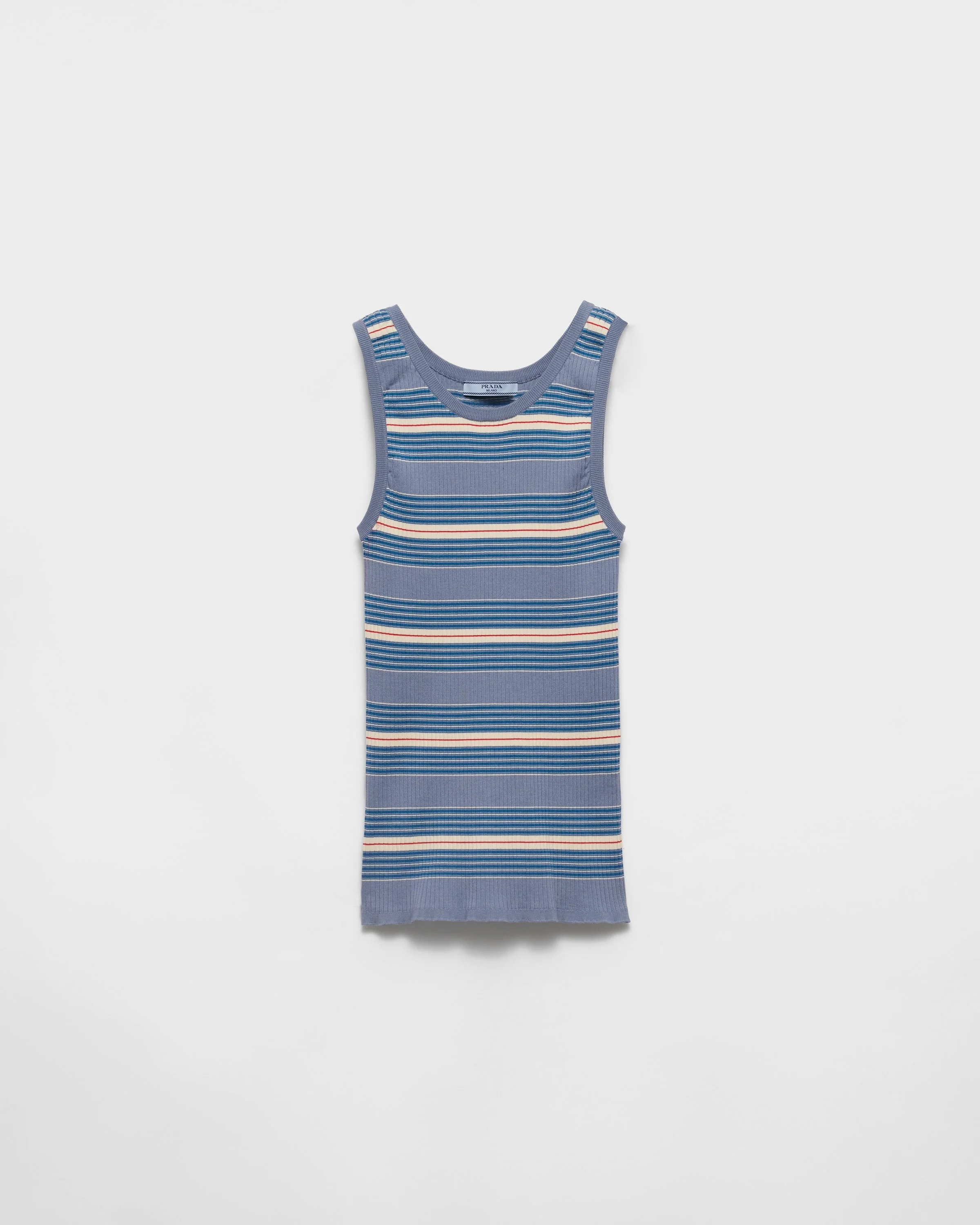 Ribbed knit enriches the texture of this sleeveless stretch cotton top. The stripe motif, a classic of the summer season, animates the slim-fit garment decorated with the iconic triangle logo. - Product code: P29B83_17KJ_F0237_S_OOO - Sleeveless - Ribbed knit - Slim-fit silhouette - Fabric triangle logo and sartorial logo label - Imported - The model is 181 cm tall and wears a size 38 Height: 60cm MATERIALS Main material: 100% cotton