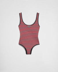 This one-piece swimsuit made of interlock fabric plays with the stripe motif, an icon of the nautical world. The enameled metal triangle logo completes the garment with a distinctive note. - Product code: 70221_16ZS_F0N98_S_OOO - Enameled metal triangle logo - Imported - The model is 178 cm tall and wears a size 38 MATERIALS Main material: 10% elastane 90% recycled polyester