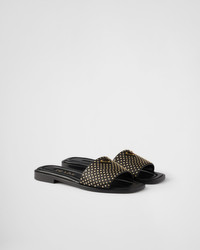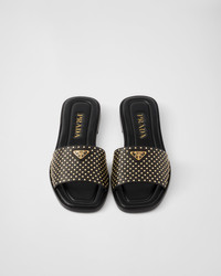 These leather slides defined by a sleek, versatile silhouette are enriched with shiny mini studs that add character to the style with simple lines. - Product code: 1XX760_ZHP_F0002_F_010 - Upper with micro studs - Enameled metal triangle logo - Monoblock leather sole with hot-stamped logo - Heel height 10 mm - Imported MATERIALS Main material: Lambskin