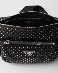 This modern Re-Nylon bag combines soft lines, sporty accents, and the contemporary edge of all-over mini studs. The distinctive triangle logo embellishes the versatile design with an adjustable shoulder strap. For sustainable care to preserve the product's characteristics and reduce microfiber shedding, we recommend not washing the item too often. Let the product air out after every use and have it dry cleaned at a specialized ecological dry cleaners. - 商品品番: 1BC235_2HGV_F0002_V_OOO - Adjustable woven tape shoulder strap. Maximum length 135 cm - Minimum length 85 cm - Maximum drop 65 cm - Minimum drop 40 cm - Front zipper pocket - Metal hardware - Pocket with enameled metal triangle logo - Zipper closure - Logo-print Re-Nylon lining with zipper pocket - インポート 高さ: 18cm 幅: 28cm マチ: 9cm MATERIALS : Recycled polyamide