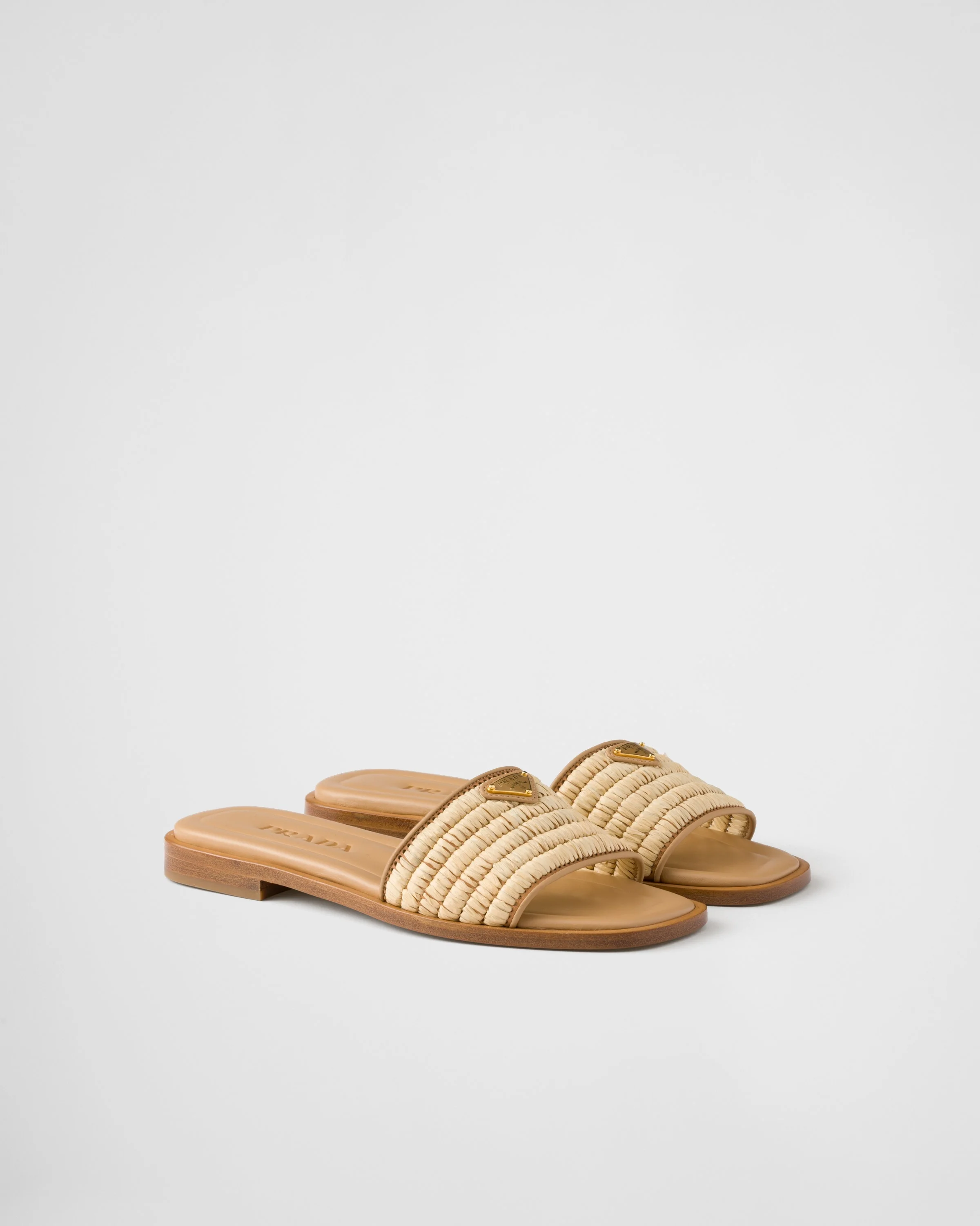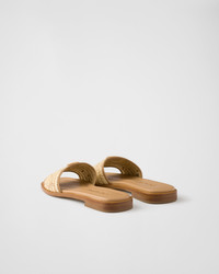 These flat leather sandals with crochet details defined by a sleek, versatile silhouette are embellished by the emblematic enameled metal triangle logo. - Product code: 1XX758_2ACS_F0018_F_010 - Enameled metal triangle logo - Monoblock leather sole, 10 mm, with hot-stamped logo - Imported MATERIALS Main material: Viscose