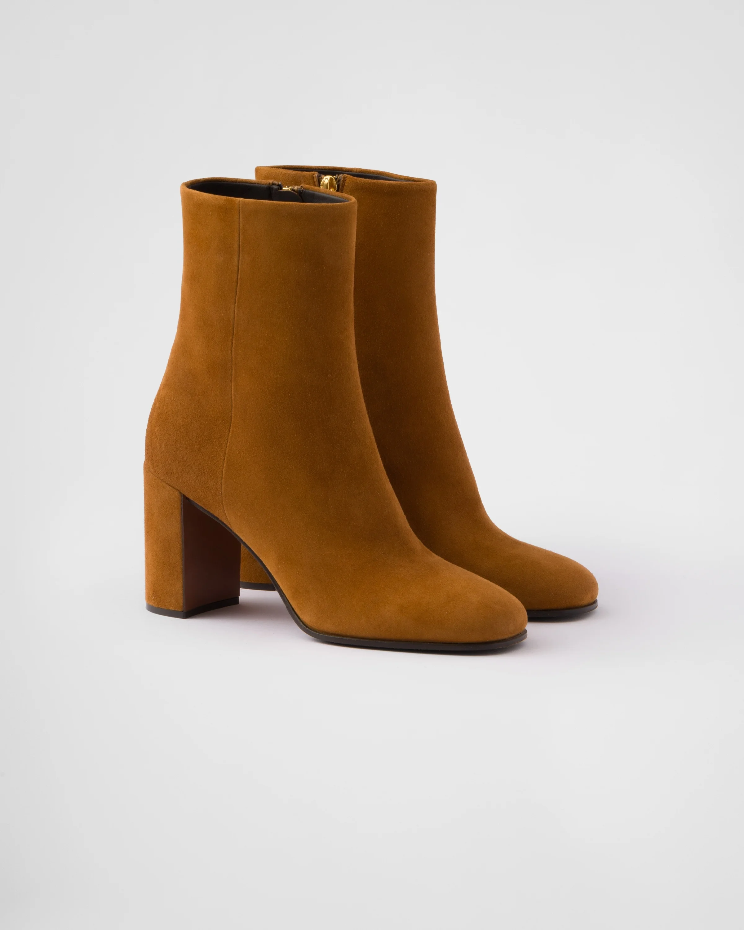 The sleek, refined design of these booties is emphasized by the soft touch of suede that adds a versatile and contemporary character to the footwear. - Product code: 1T631N_008_F0046_F_085 - Leather lining - Side zipper closure - Boot leg: 16 cm - Leather and rubber sole with hot-stamped logo - Suede-covered heel with enameled metal triangle logo, height 85 mm - Imported MATERIALS Main material: Lambskin