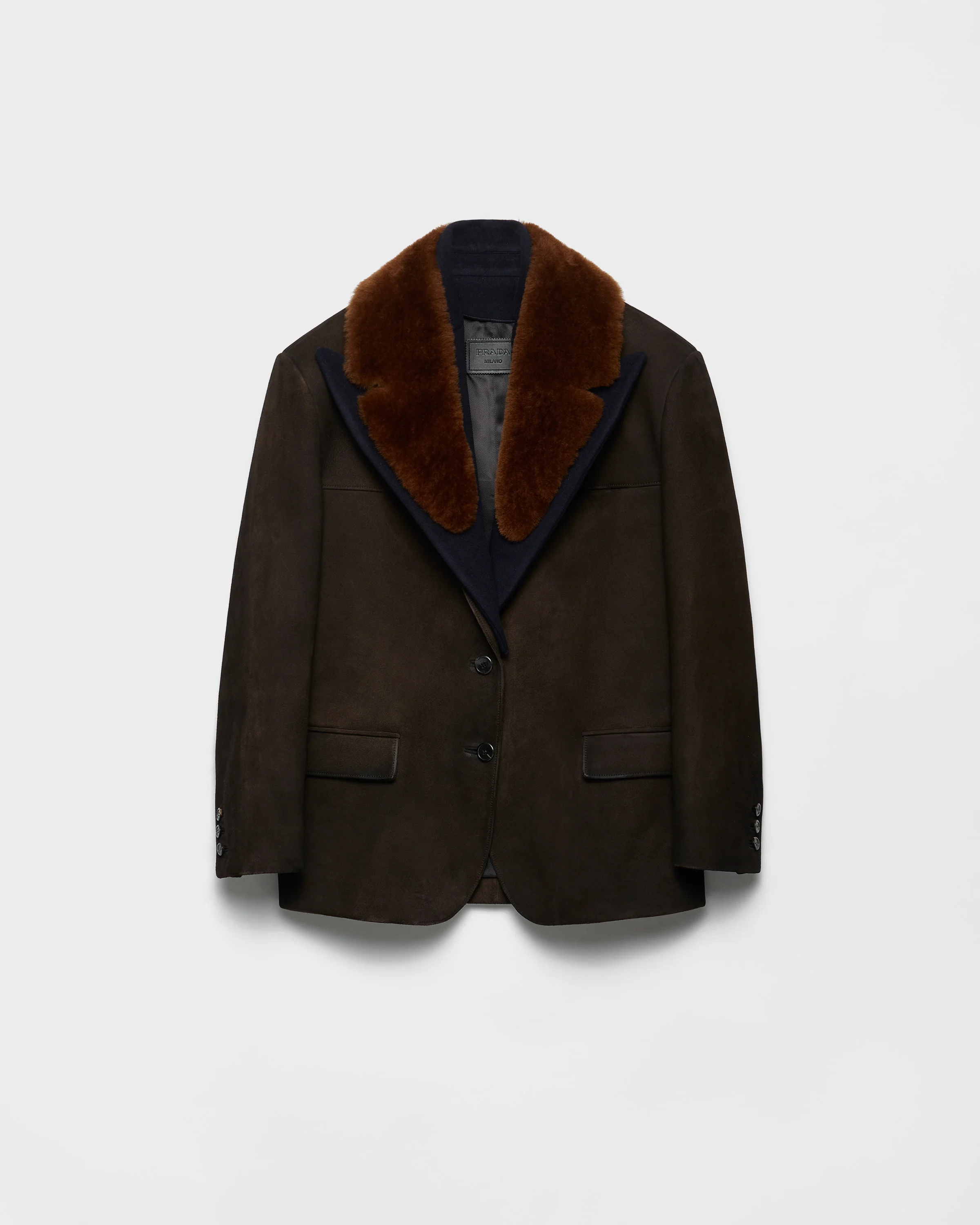 Unexpected combinations of contrasting textures and shapes define this suede caban jacket. The cloth and shearling collar enriches the palette of materials that defines the sophisticated tailored garment. - Product code: 56A222_1V97_F0192_S_OOO - Lined garment - Oversized fit - Front button closure - Side slits - Classic notch lapel - Straight sleeves - Flap pockets - Leather triangle logo at center-back - Vintage treatment--Cloth and shearling collar - Imported - The model is 178 cm tall and wears a size 38 Height: 74cm MATERIALS Main material: Lambskin