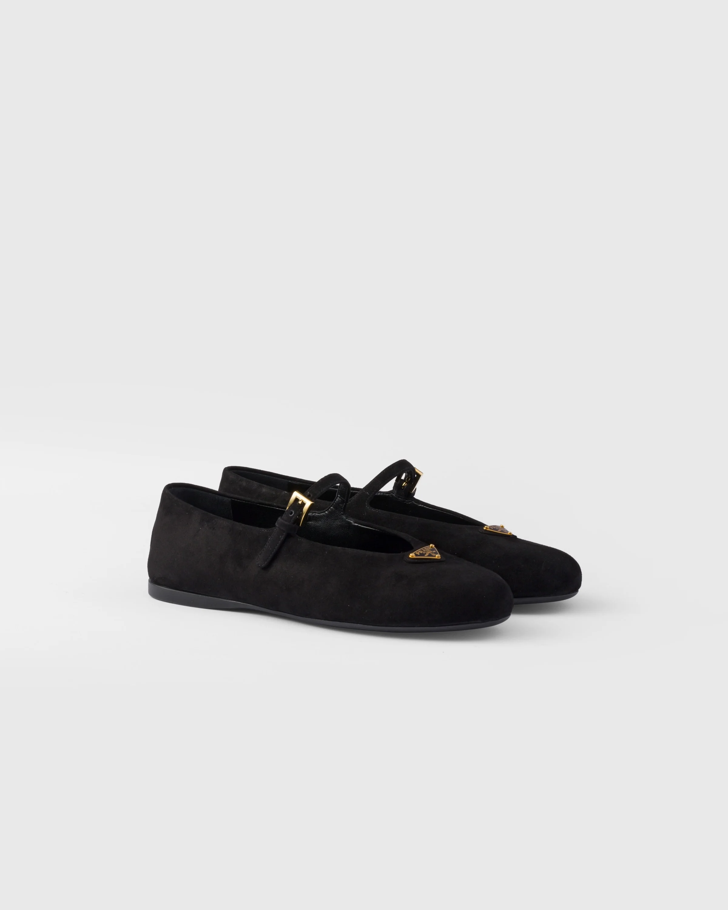 These suede ballerinas with a tapered silhouette express elegant, feminine charm. The shoe with a round toe and rubber sole is defined by classic lines and sophisticated details and is embellished with the enameled metal triangle logo. - Product code: 1F793N_008_F0002_F_005 - Upper with strap and logo-engraved metal buckle - Enameled metal triangle logo - Monoblock rubber sole, 05 mm, with hot-stamped logo - Imported MATERIALS Main material: Goatskin