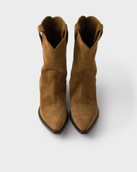Folk style inspires the design of these suede boot. The stitching detail and Prada logo reveal the meticulous craftsmanship dedicated to a timeless style. - Product code: 1U001O_054_F0005_F_045 - Leather lining - Screen-printed logo - Boot leg 25 cm - Leather and rubber sole with enameled metal triangle logo - Heel height 45 mm - Imported MATERIALS Main material: Calfskin