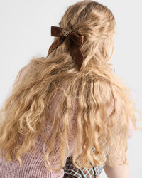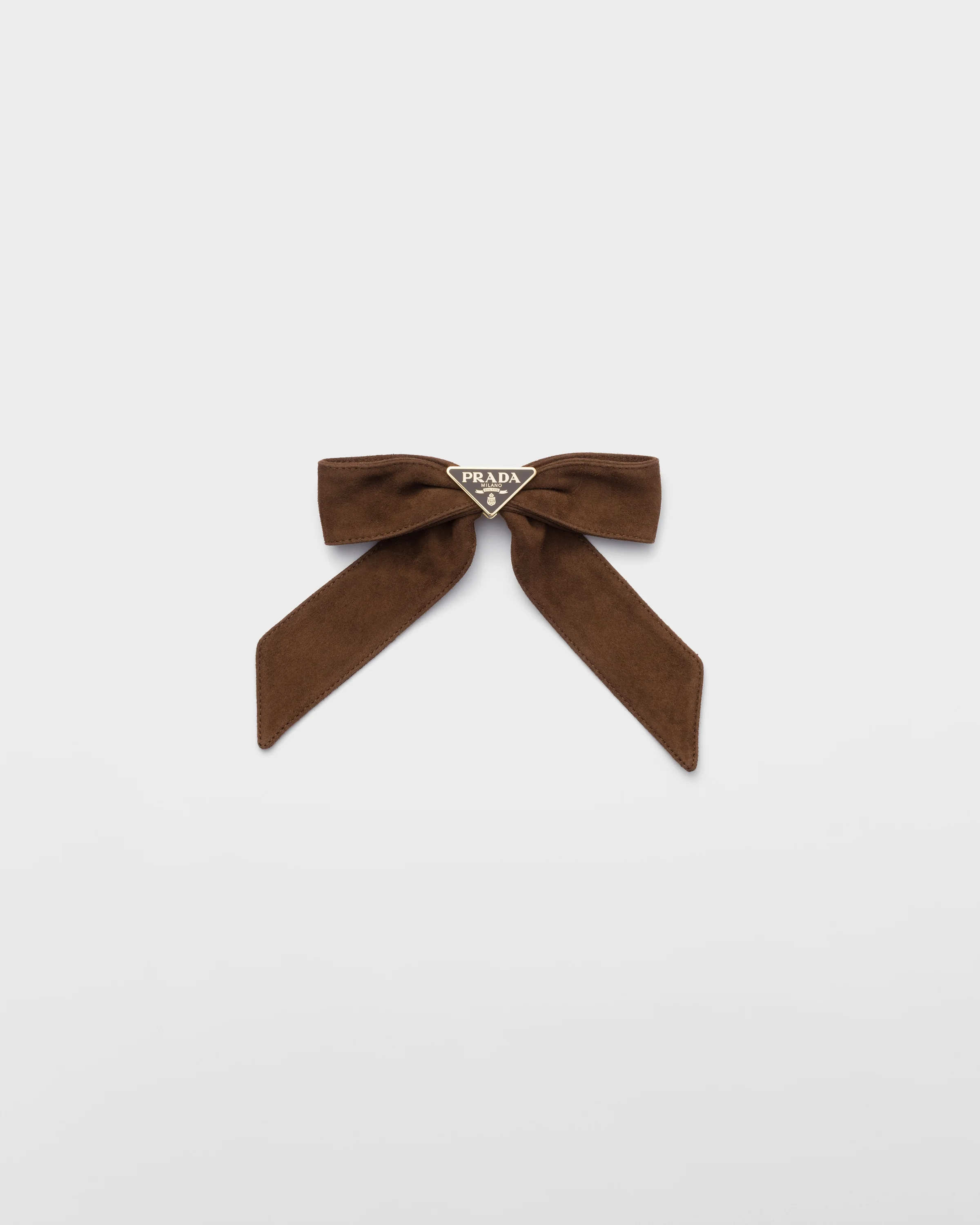 This suede hair clip featuring a bow with sophisticated allure is decorated with the enameled metal triangle logo. - Product code: 1IF154_008_F0324 - Clip closure - Enameled metal triangle logo - Imported Height: 3.6cm Width: 15cm MATERIALS Main material: Lambskin
