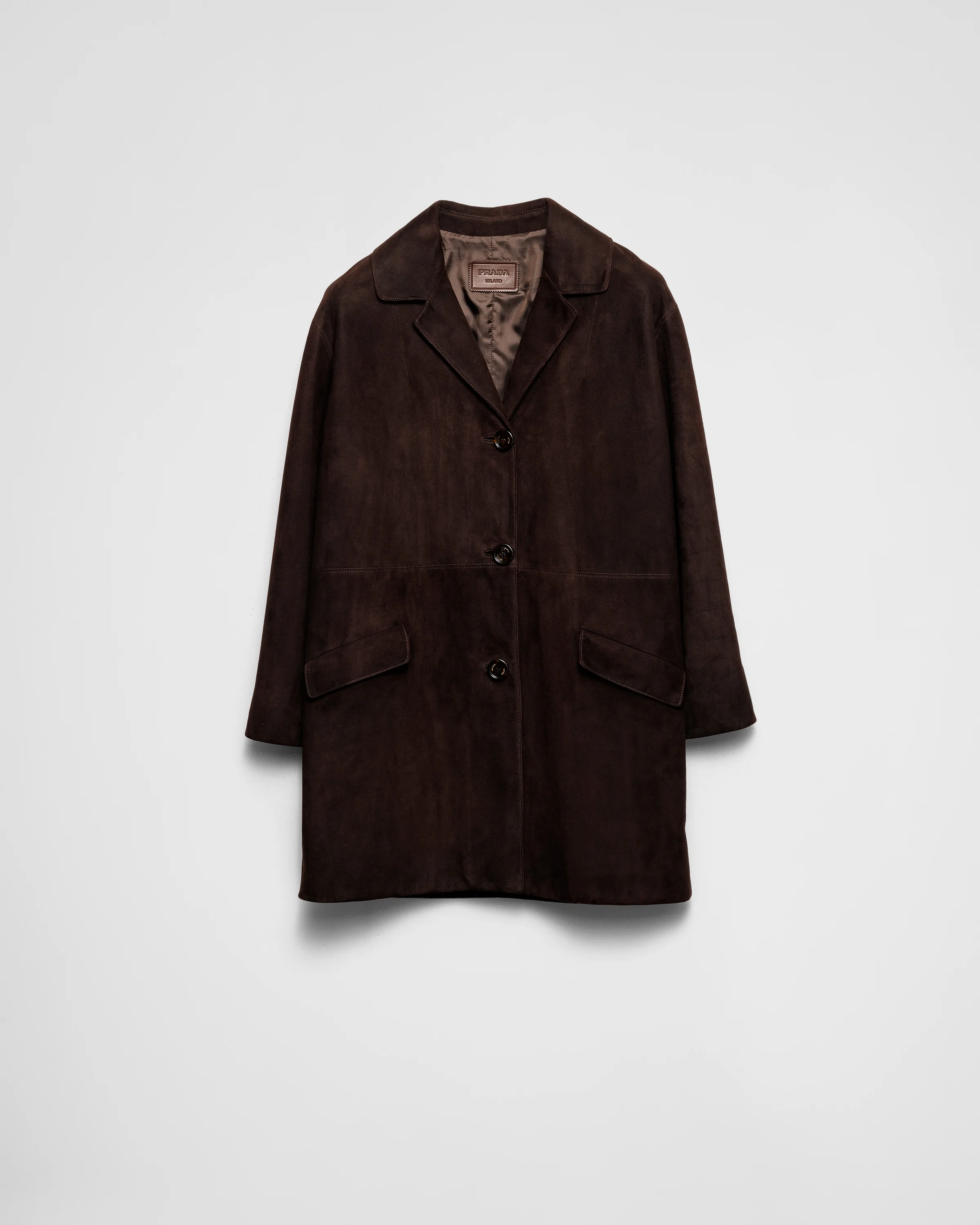 A silhouette with refined details characterizes this suede coat blending a retro inspiration and contemporary minimalism. - Product code: 56A157_I9P_F0201_S_OOO - Lined - Oversized fit - Center button closure - Side slits - Notch lapels - Straight sleeves - Flapped pockets - Final waxing treatment - Imported Height: 88cm MATERIALS Main material: Lambskin