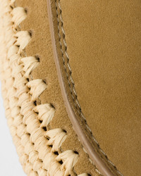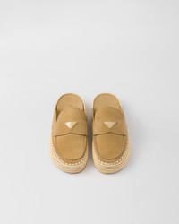 These suede flatform mules, an expression of artisanal excellence, feature a construction with woven raffia that evokes an atmosphere of sophisticated lightness. - Product code: 1S872N_054_F0379_F_010 - Woven raffia - Enameled metal triangle logo - Rubber sole, 10 mm - Tread with geometric pattern - Imported MATERIALS Main material: Calfskin