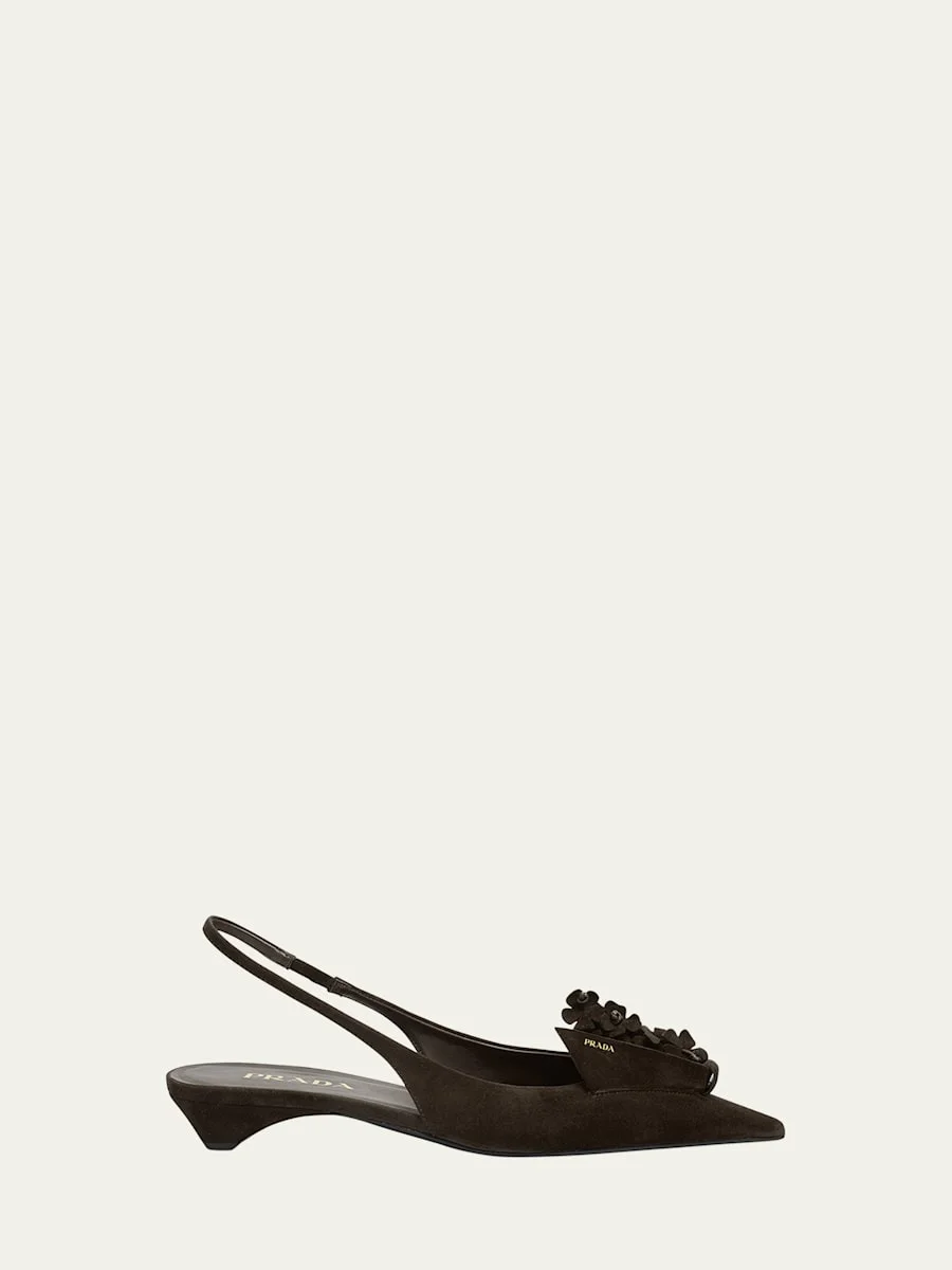 Prada suede pumps with tonal floral detailing 1.00 in / 25 mm kitten heel Pointed toe Elastic slingback strap Leather outsole Lining: Leather Made in Italy